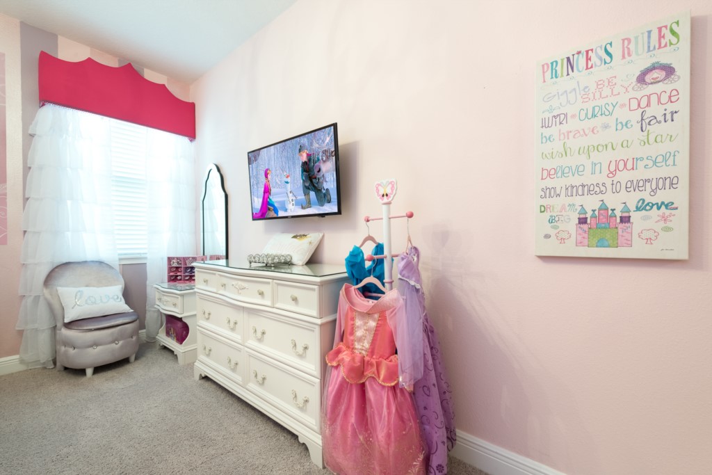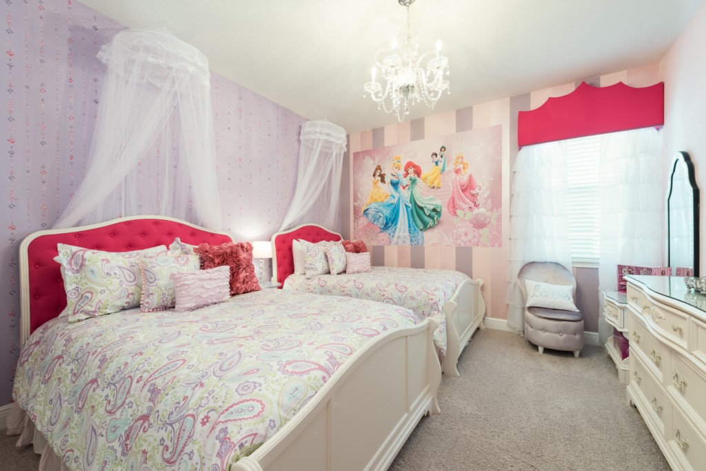 Princess themed bedroom with 2x Full sized beds, en suite (shower), and princess dresses