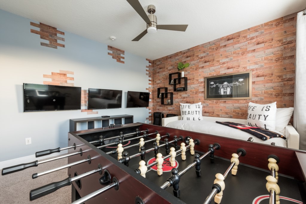A 'game room' with 2x Twin sized beds (day beds), 3x 40" LED TV's with a PS4 and X-Box One video game console, 2x gaming chairs, and a foosball table