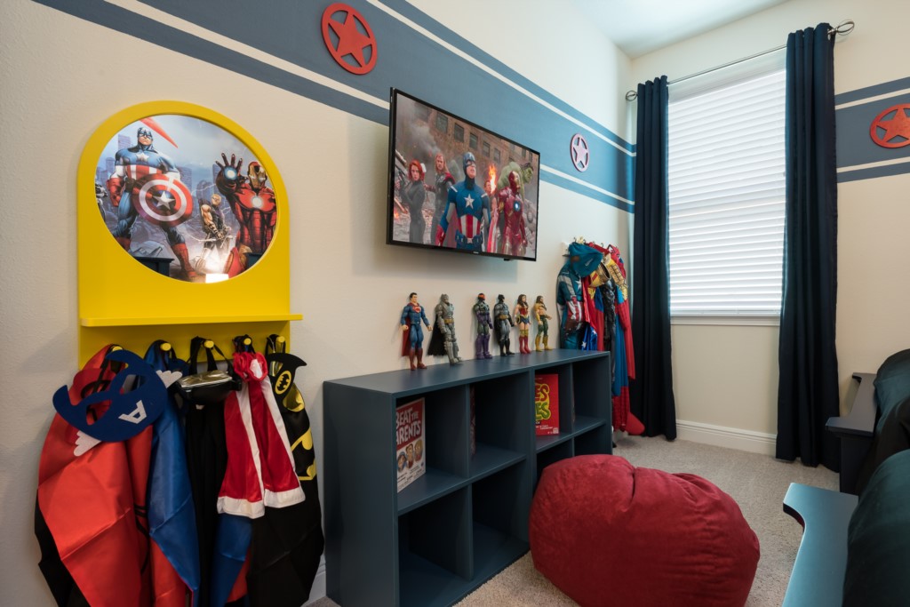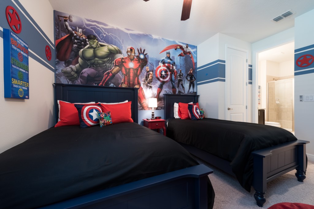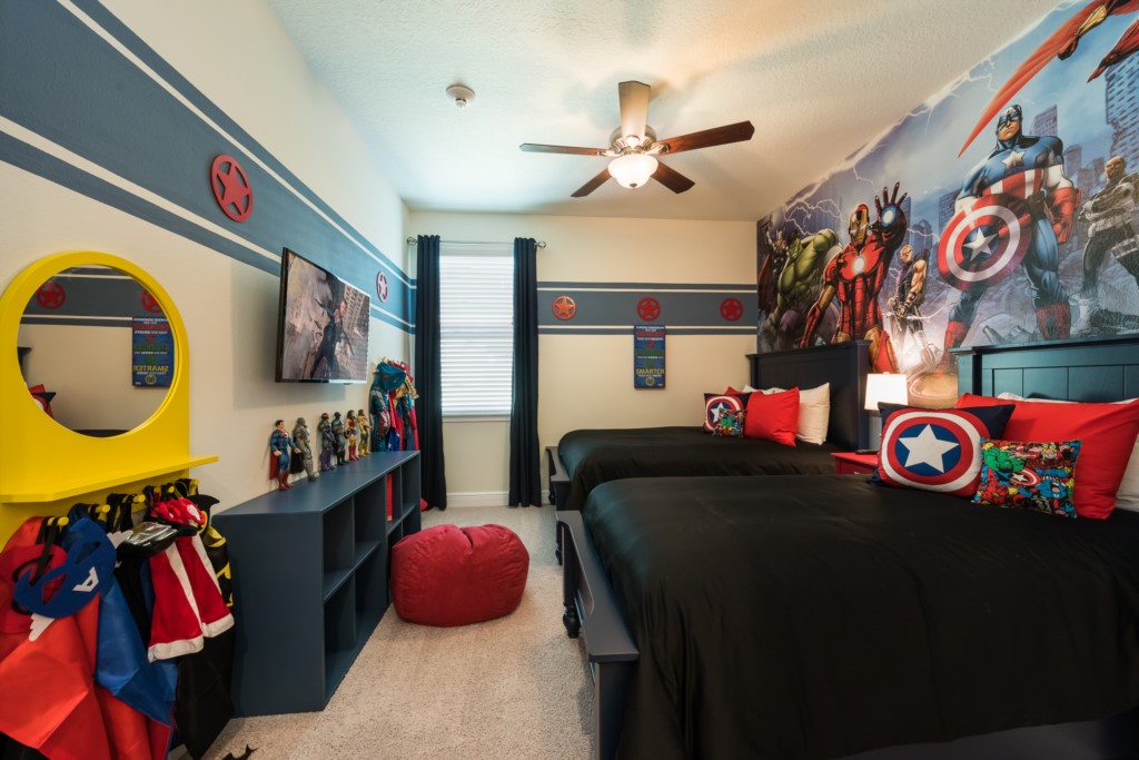Superheroes themed bedroom with a Full and a Twin sized bed, en suite (shower), bean bag chair, board games and superhero costumes