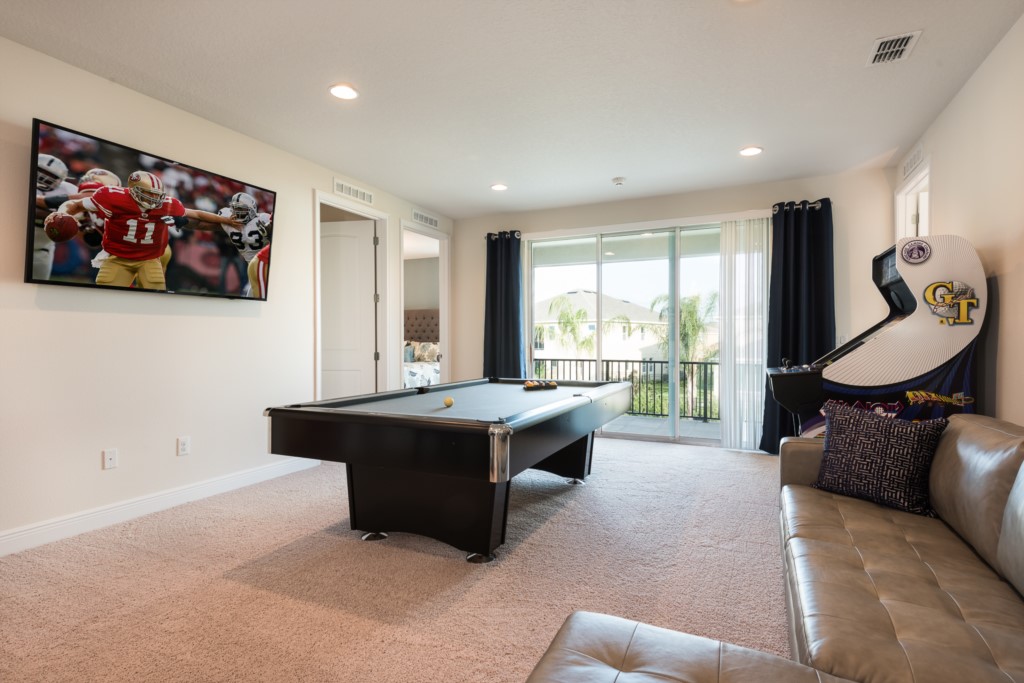 Upstairs loft area has a wet bar (sink, mini fridge), 2x accent chairs, leather sectional, 2 seat high top table with tic tac toe board, 2 seat table with checkers, 60" LED SMART TV with a blu ray player, pool table, and Arcade Legends Video Game. Loft area also has balcony access