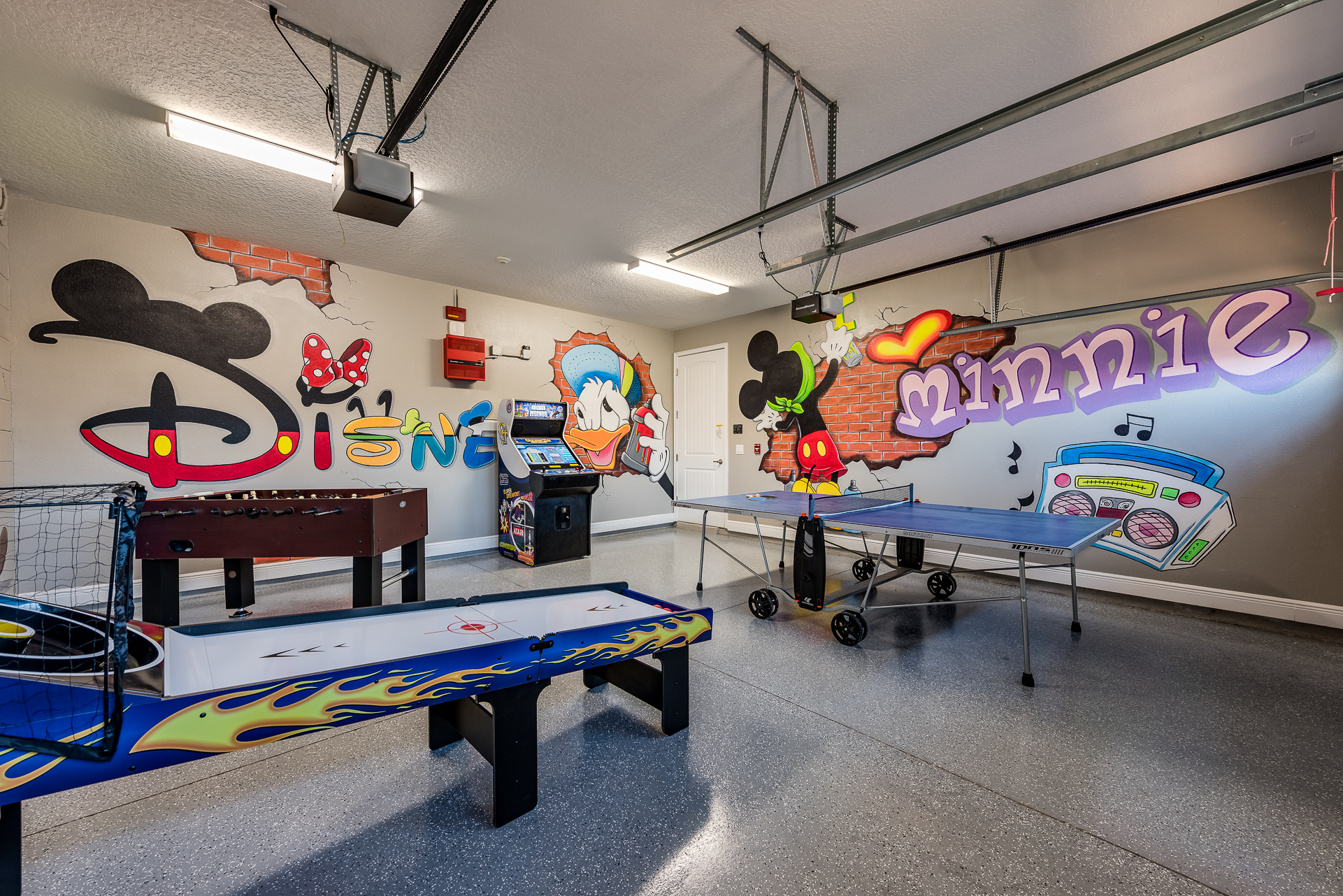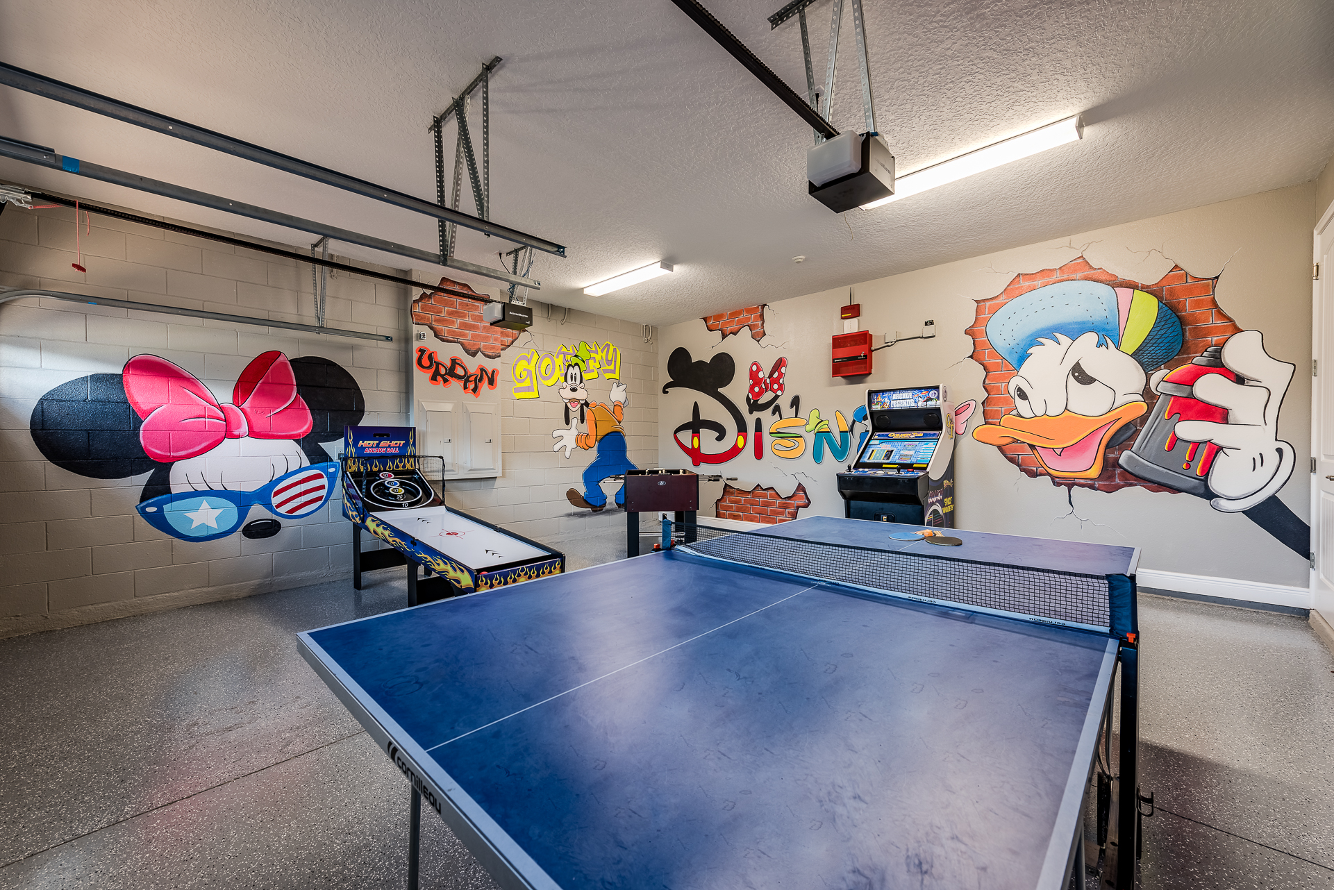 Themed games room has a ping pong and foosball table, multi-arcade video game, skeeball machine