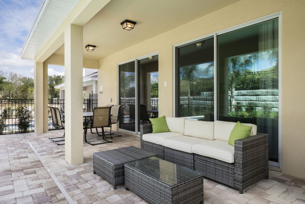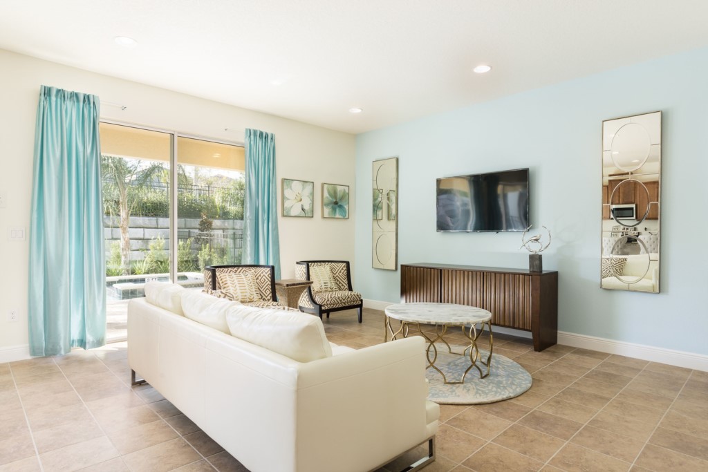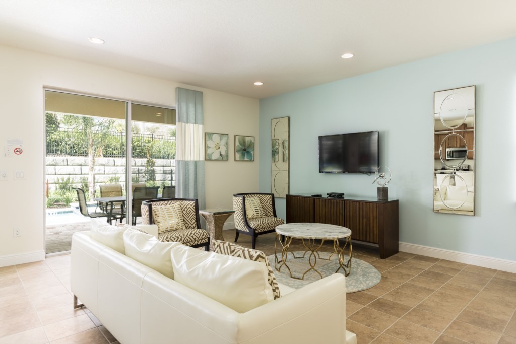 Spacious comfortable seating area with a sofa and two accent chairs overlooking the private pool deck through sliding glass doors