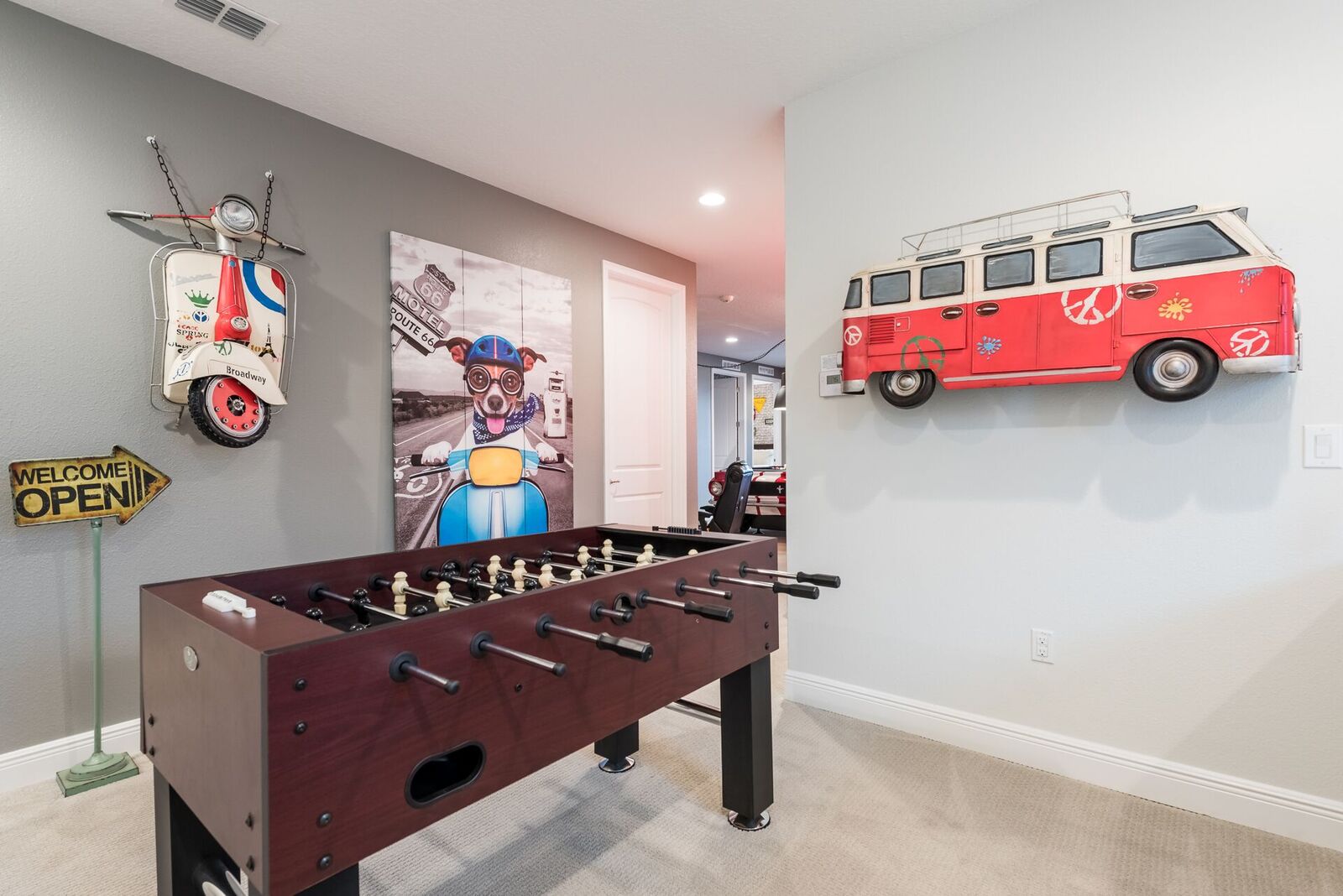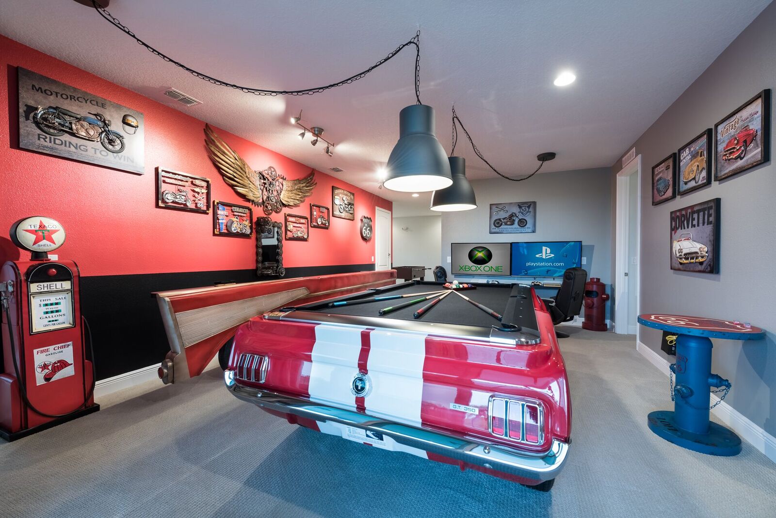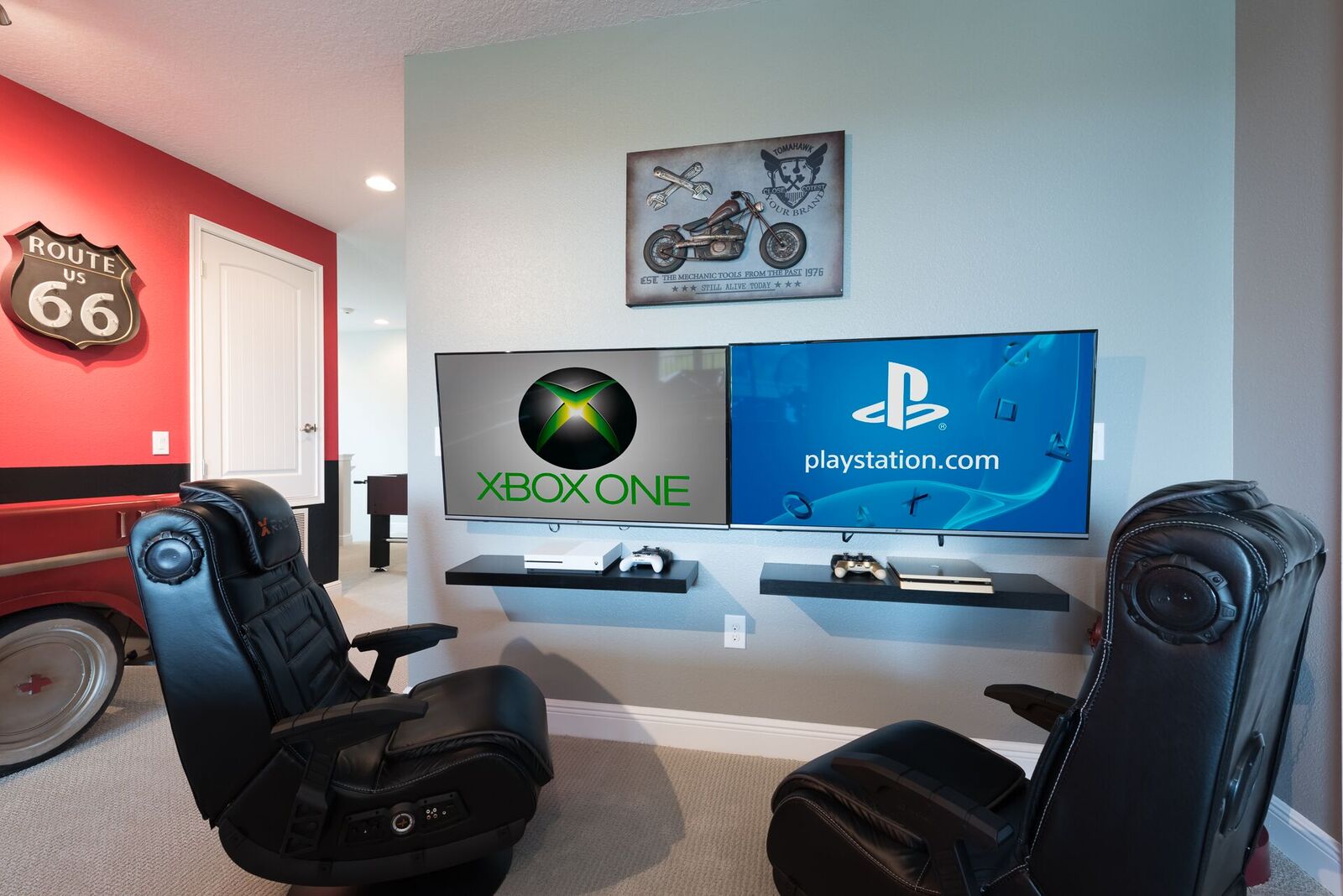 Upper floor games room has a foosball table and wet bar, a pool table, 2x large flat screen TV's with a PS4 and X-Box One video game console, 2x gaming chairs