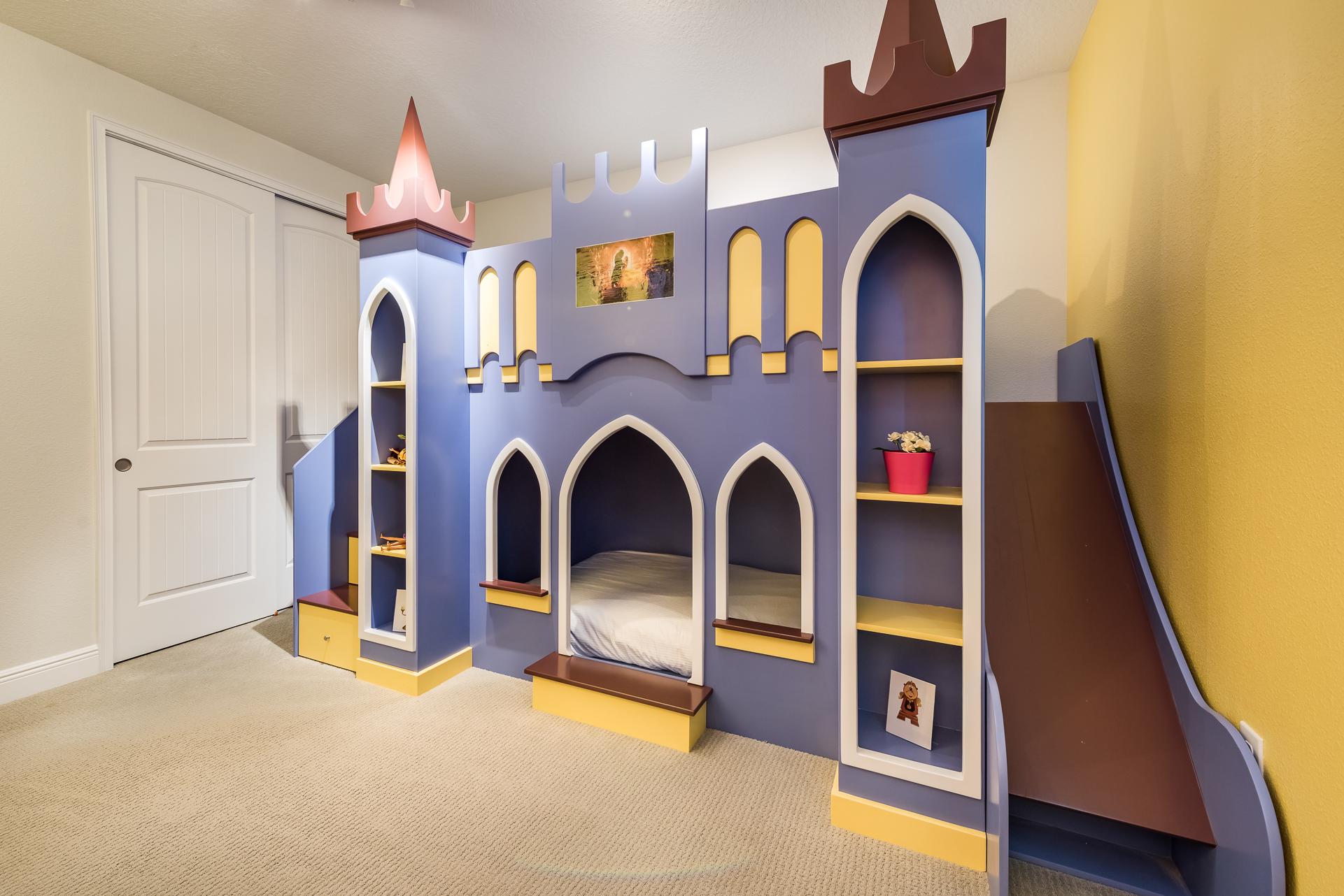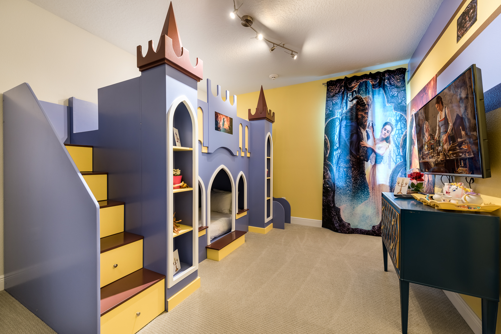'Beauty and the Beast' themed bedroom with castle bunk beds (2x Twin sized beds) and an en suite (shower)