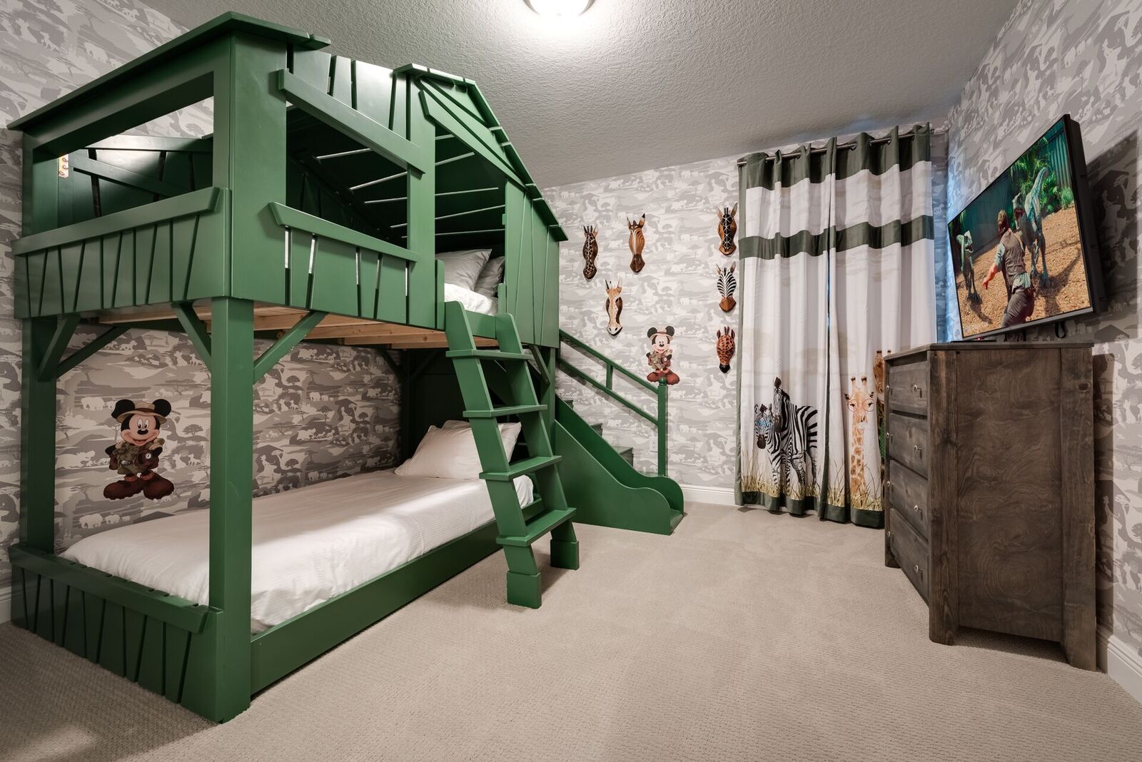 Safari themed bedroom with treehouse bunk beds (2x Twin sized beds) and an en suite (shower)