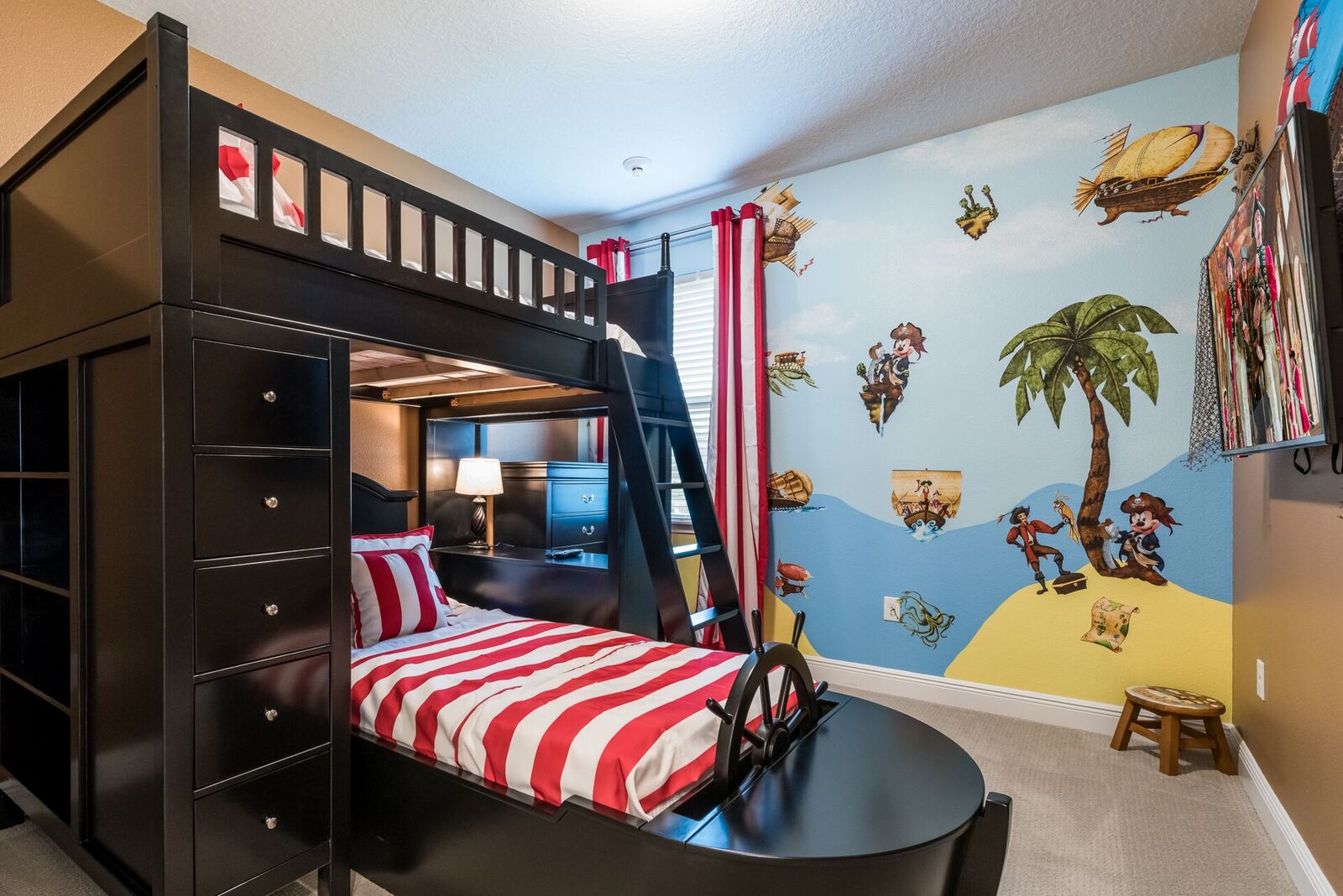 Pirates themed bedroom with a pirate ship bunk beds (2x Twin sized beds) and an en suite (shower/bath combo)