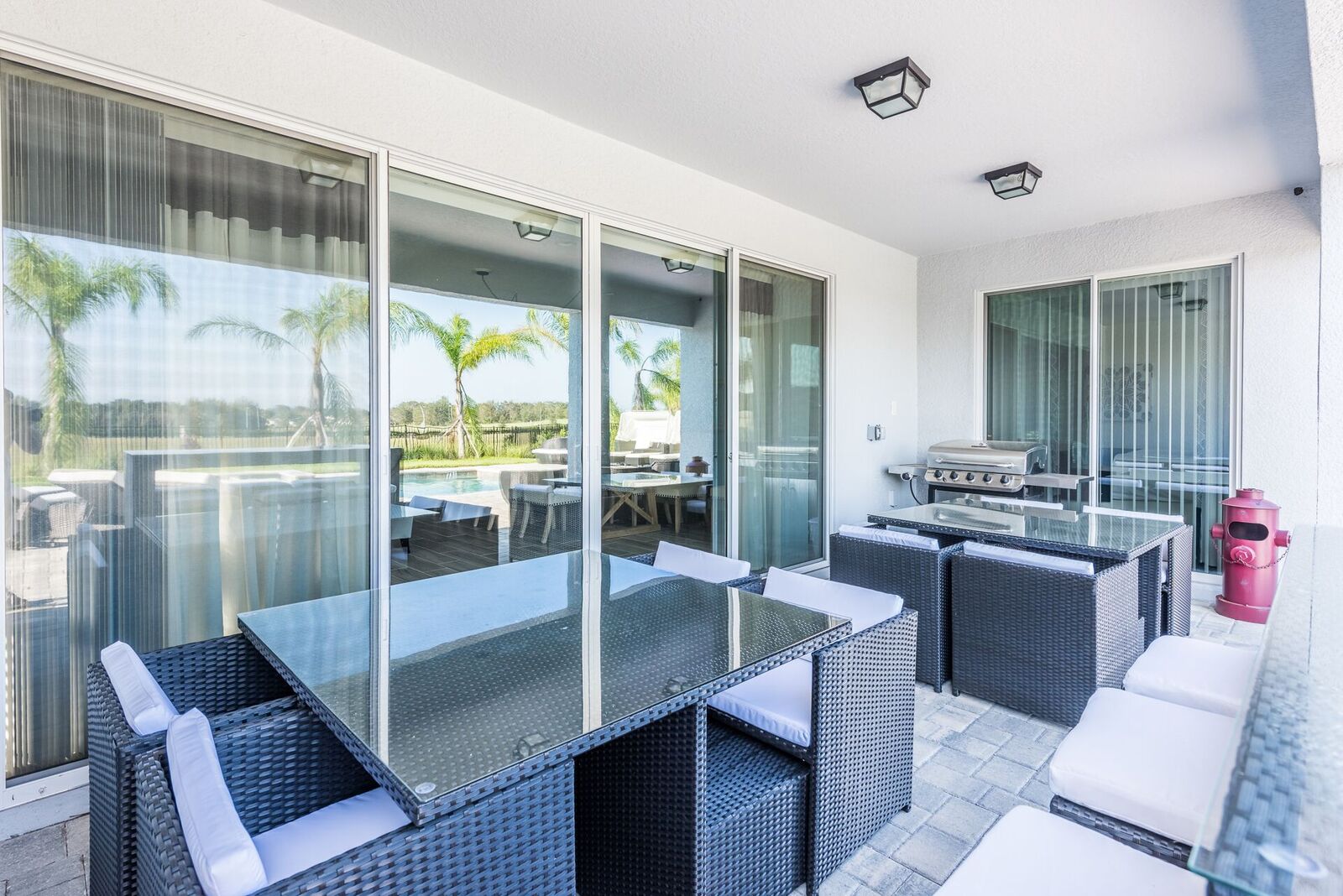 Spacious comfortable seating area with 2x sofas, 2x accent chairs, and a 4 seat high top table overlooking the private pool deck through sliding glass doors