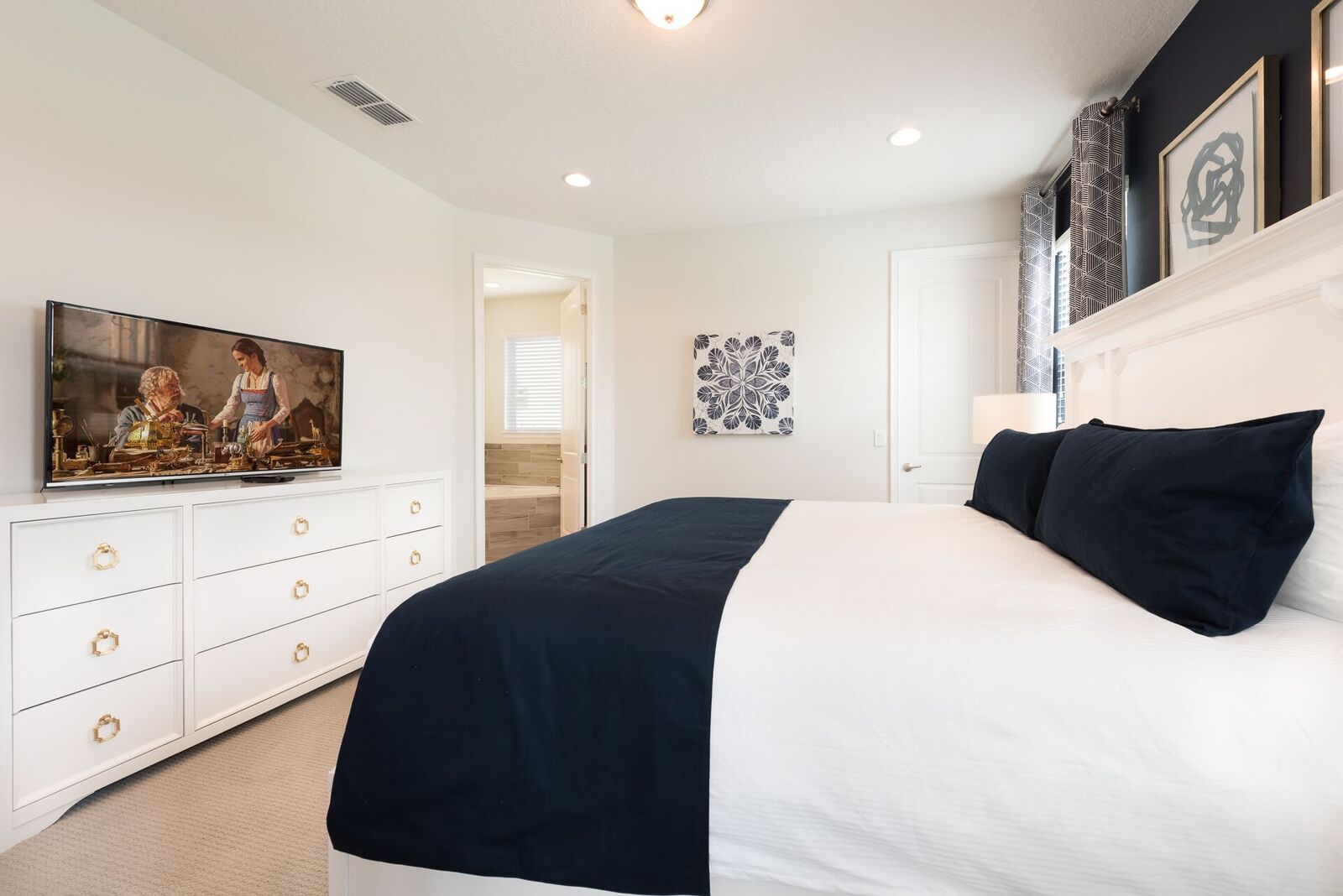 King sized Master with en suite (shower, tub, twin vanities), walk in closet, and patio access