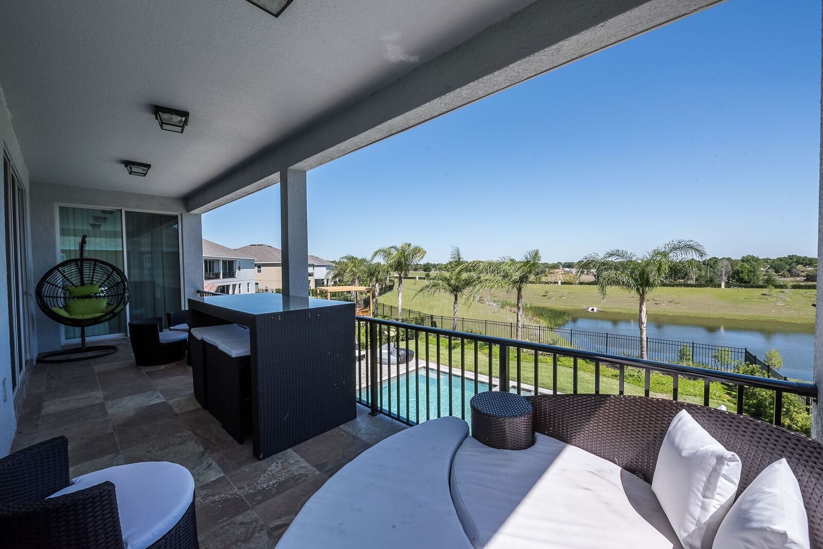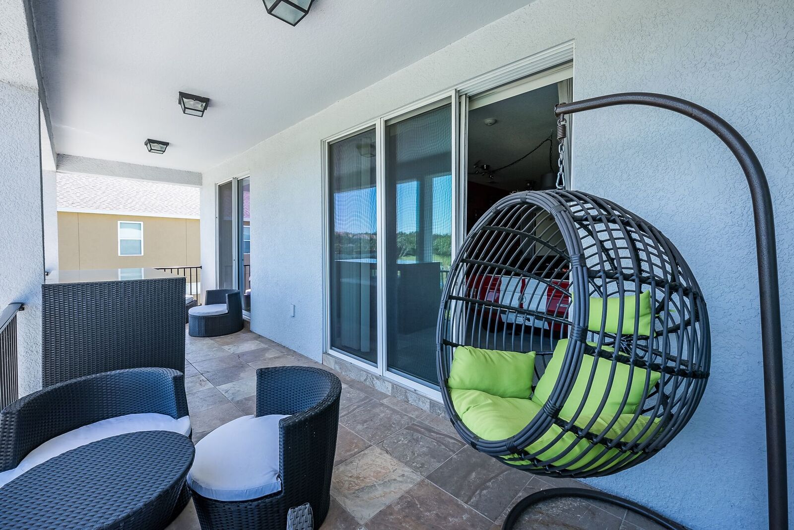 Upper floor balcony has 4x patio chairs, outdoor sofa, and a hanging basket chair
