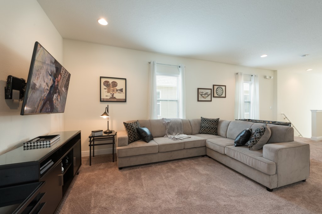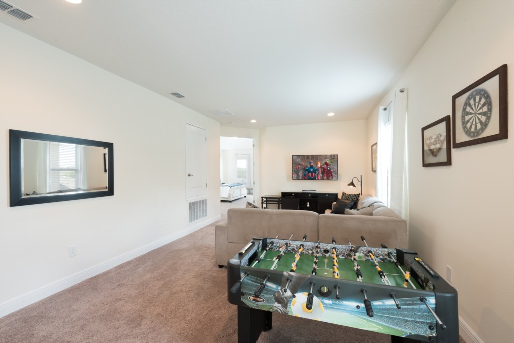 Upstairs loft area has a comfortable sectional, large flat screen TV, and a foosball table