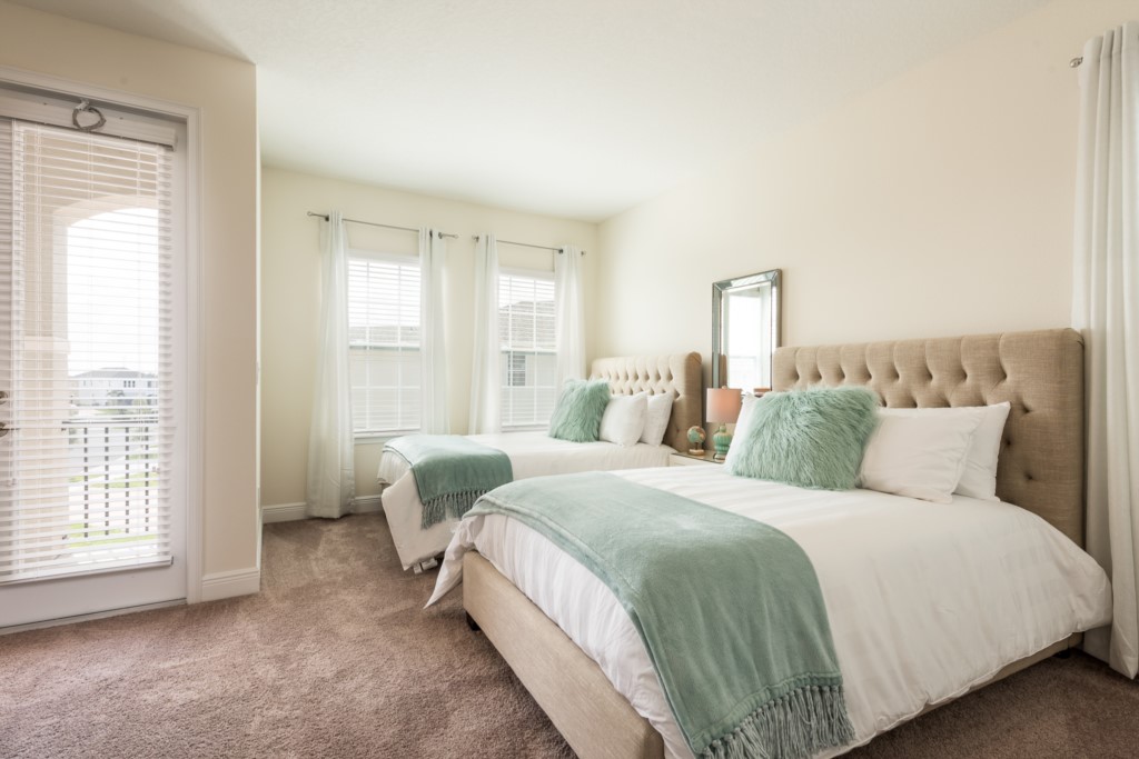 A bedroom with 2x Full sized beds, an en suite (shower/bath combo), and balcony access