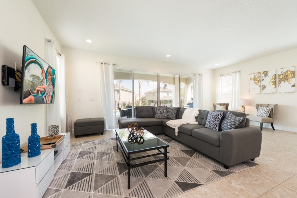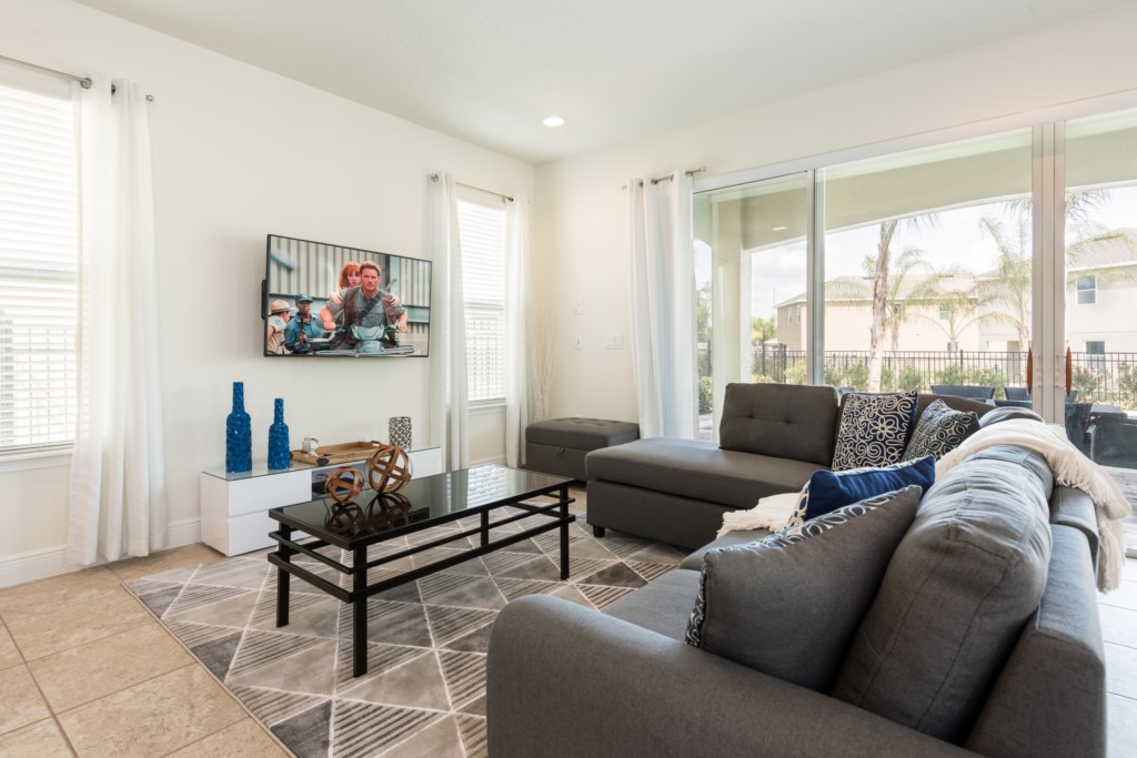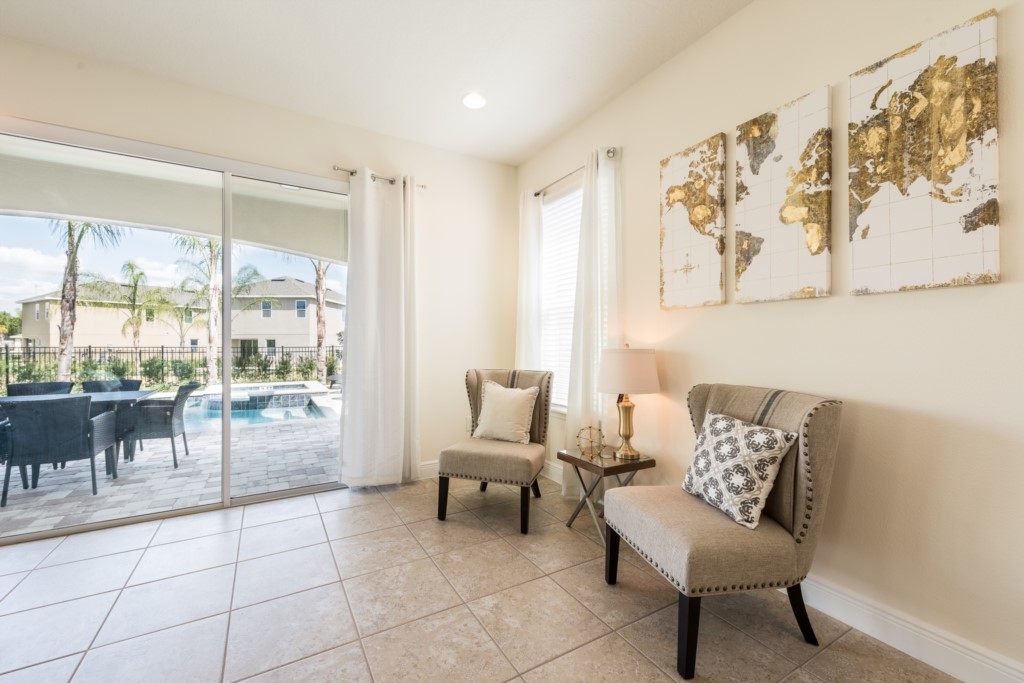 Spacious comfortable seating area with a large sectional and 2x accent chairs overlooking the private pool deck through sliding glass doors