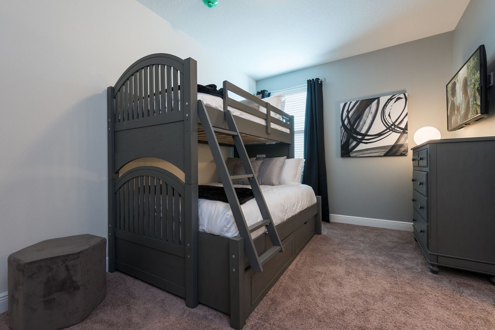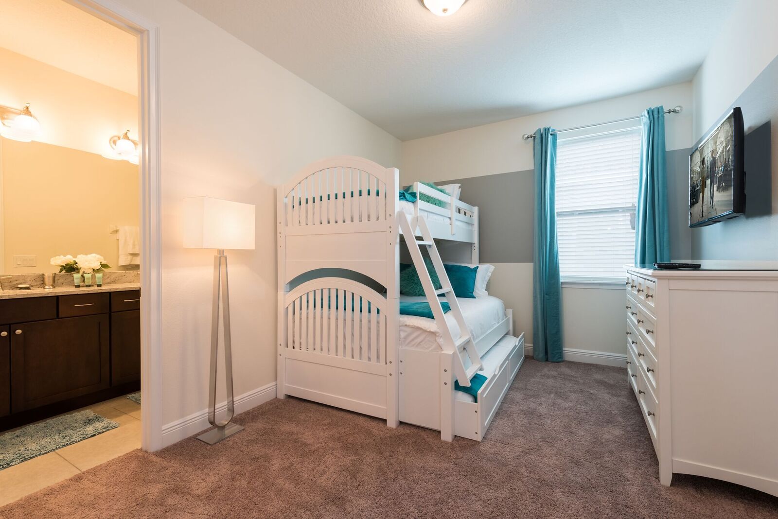 A bedroom with bunk beds (a Twin and Full sized bed, Twin pullout bed) and an en suite (shower, twin vanities)