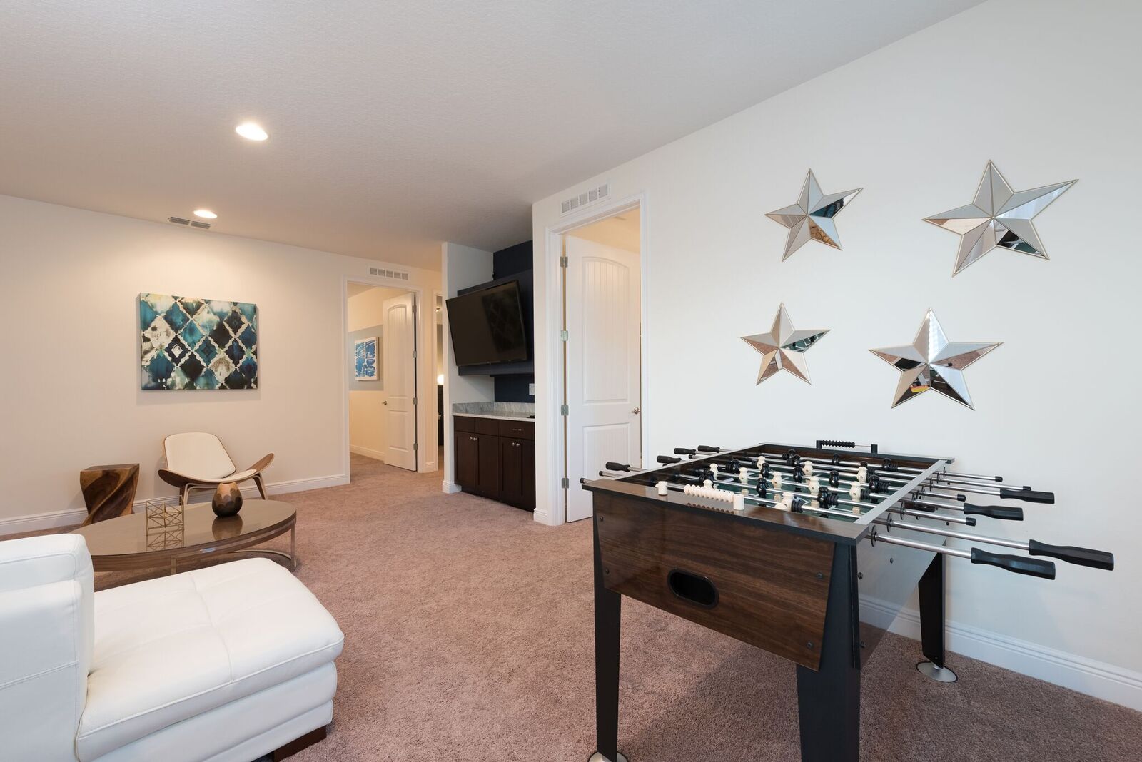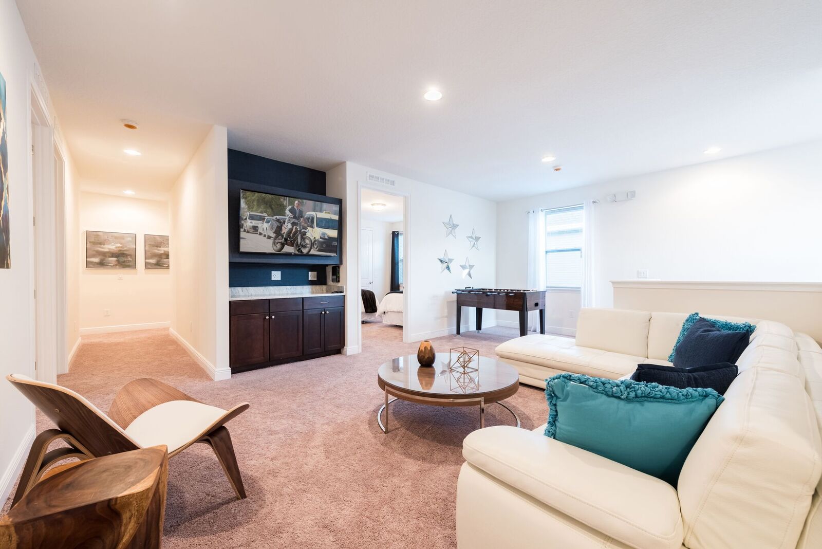 Upstairs loft area has a leather sectional, accent chair, large flat screen TV, and a foosball table