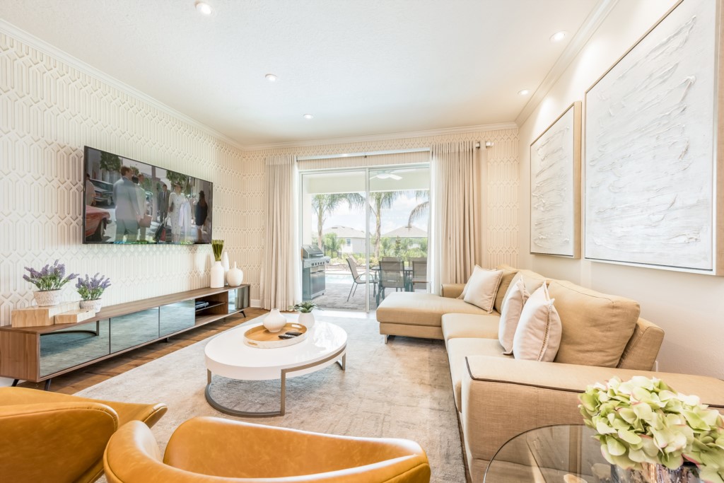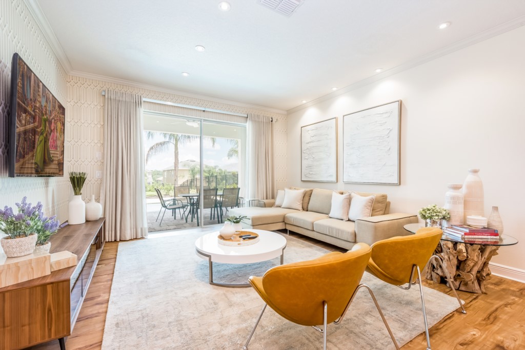 Spacious comfortable seating area with a sectional and 2x accent chairs overlooking the private pool deck through sliding glass doors