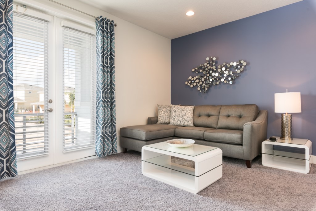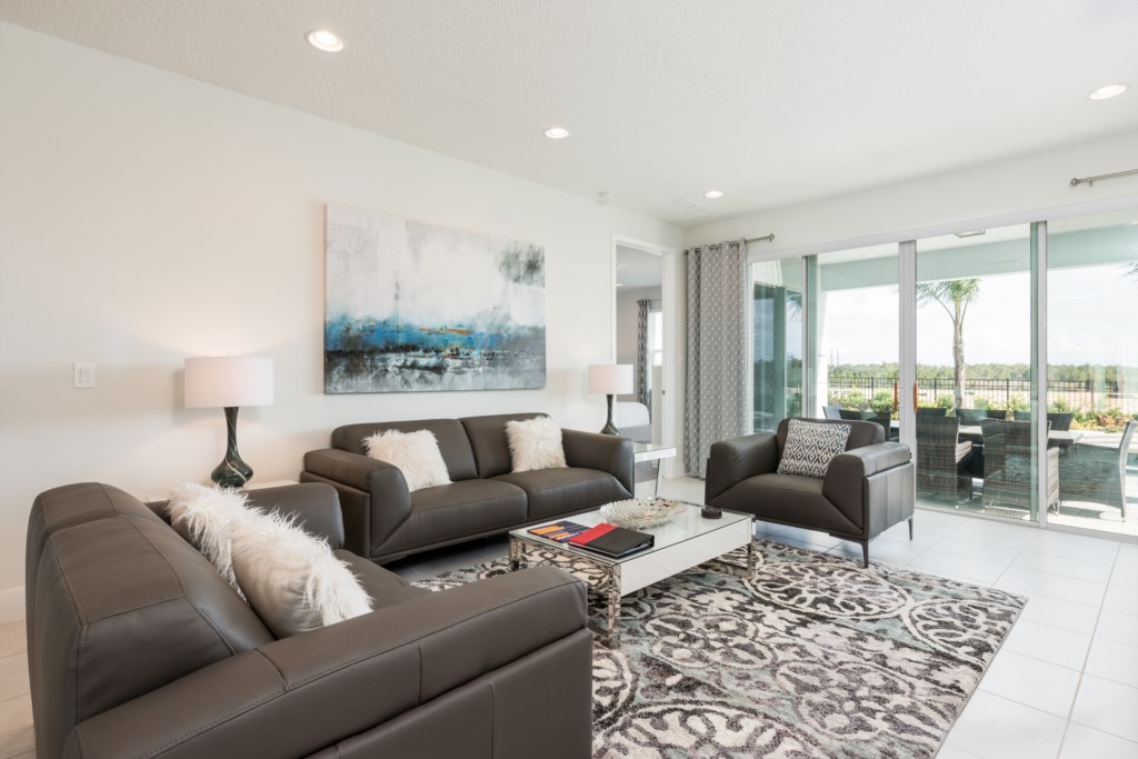 Spacious comfortable seating area with 2x love seats and an accent chair overlooking the private pool deck through sliding glass doors