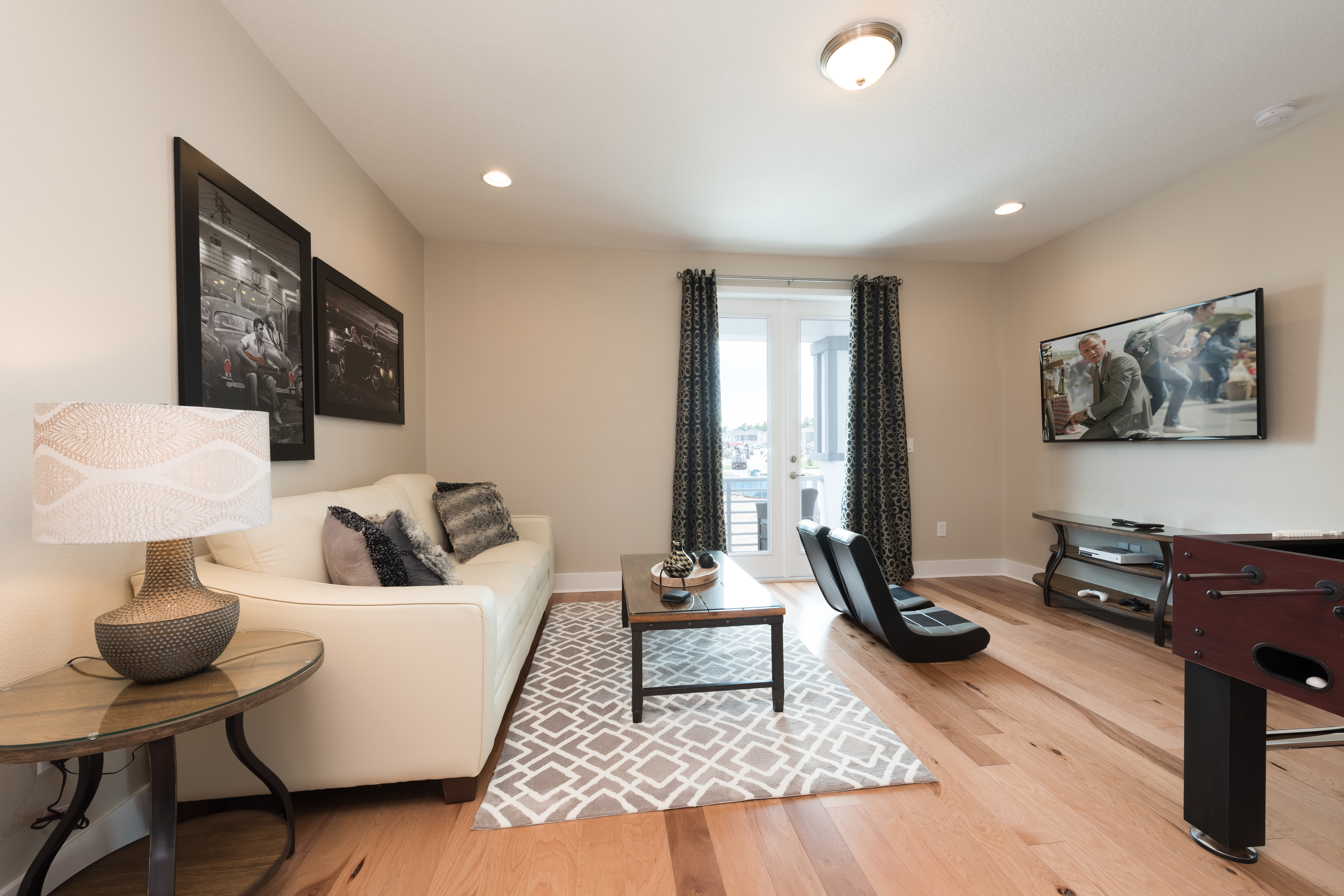 Upstairs loft area has a leather sofa, 2x gaming chairs, large flat screen TV with an X-Box One video game console, foosball table, and a private balcony over the front of the house with 2x chairs