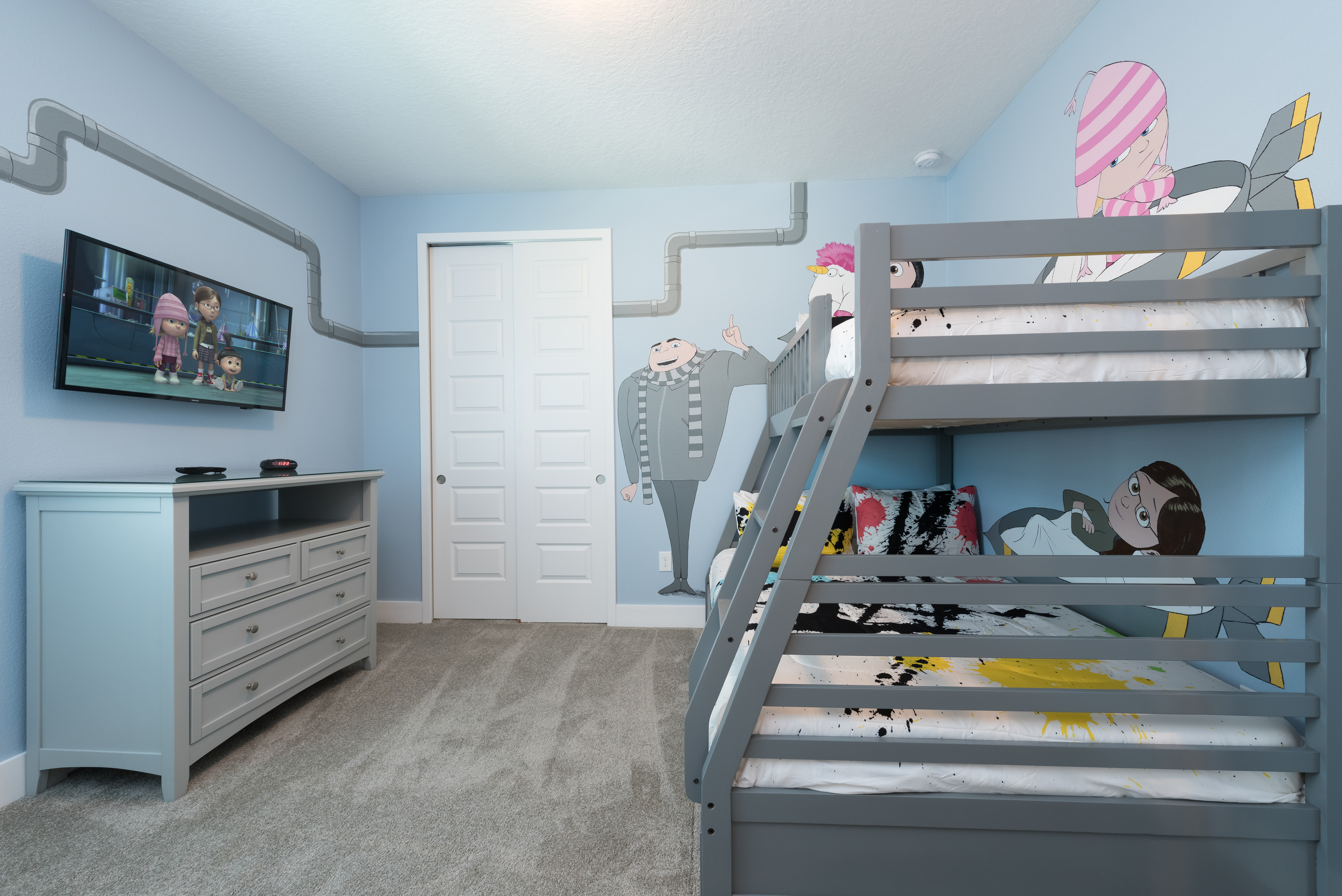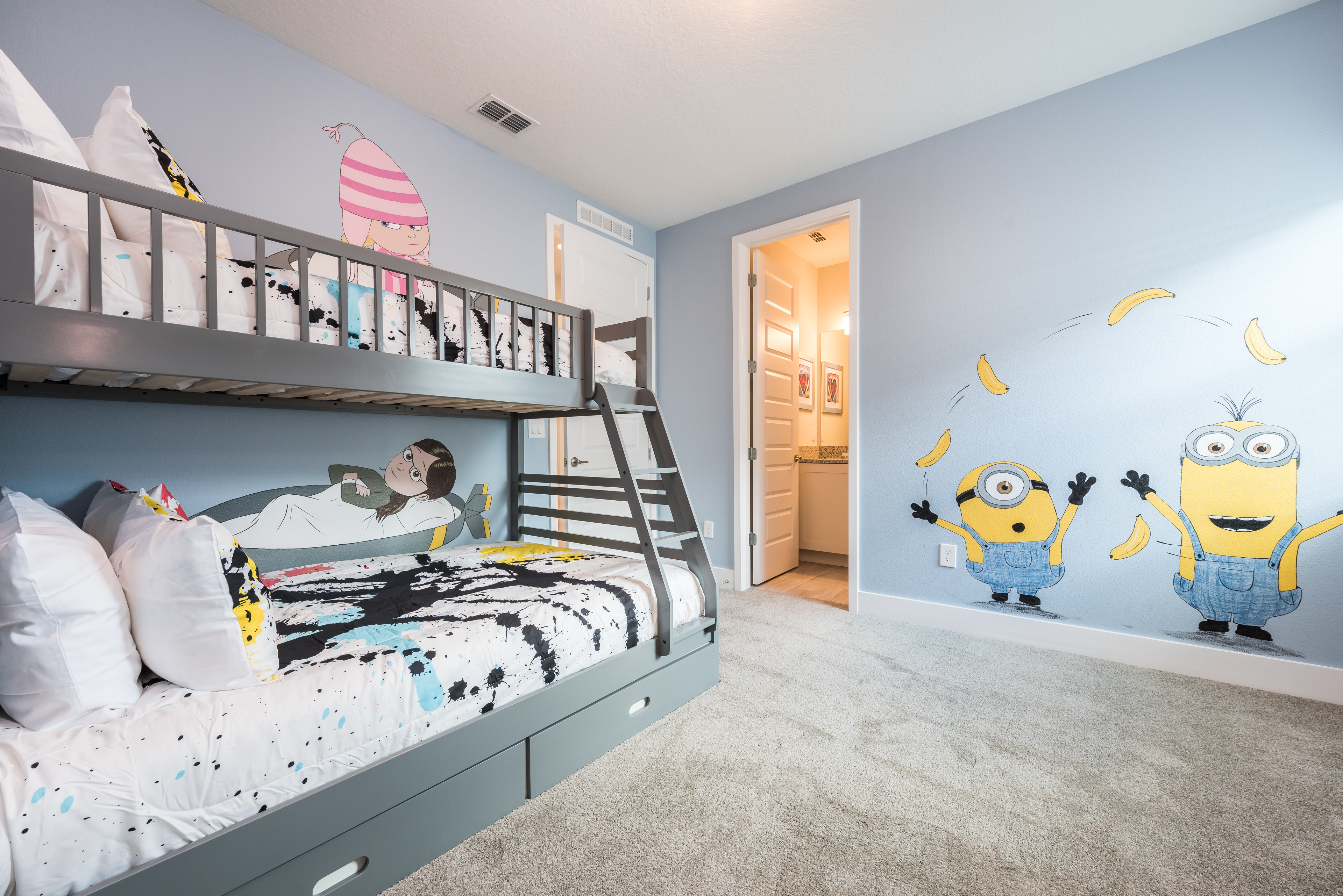 'Minions' themed bedroom with bunk beds (Twin and Full sized beds, trundle bed) and an en suite (shower)