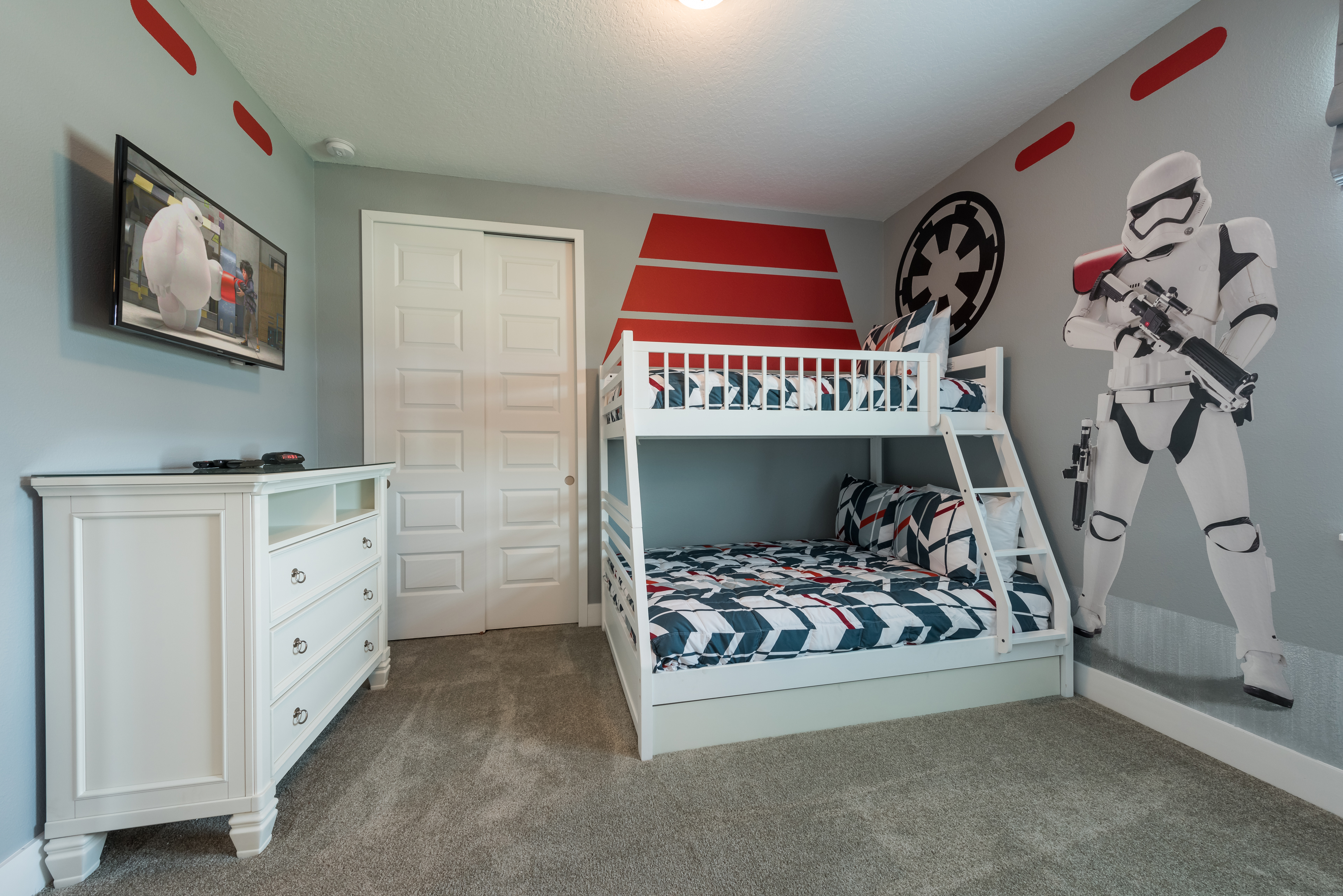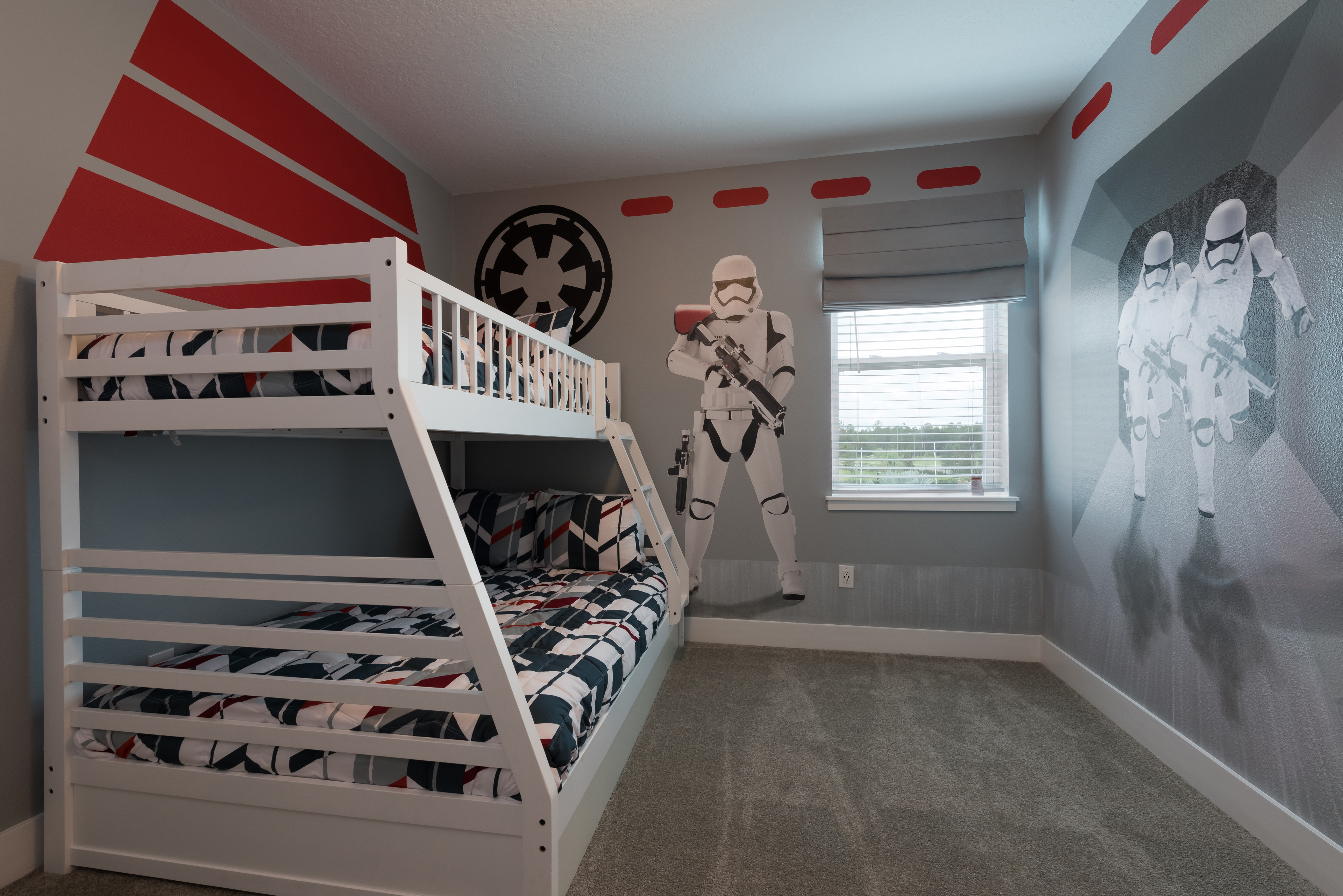 'Star Wars' themed bedroom with bunk beds (Twin and Full sized beds, trundle bed) and an en suite (shower/bath combo)