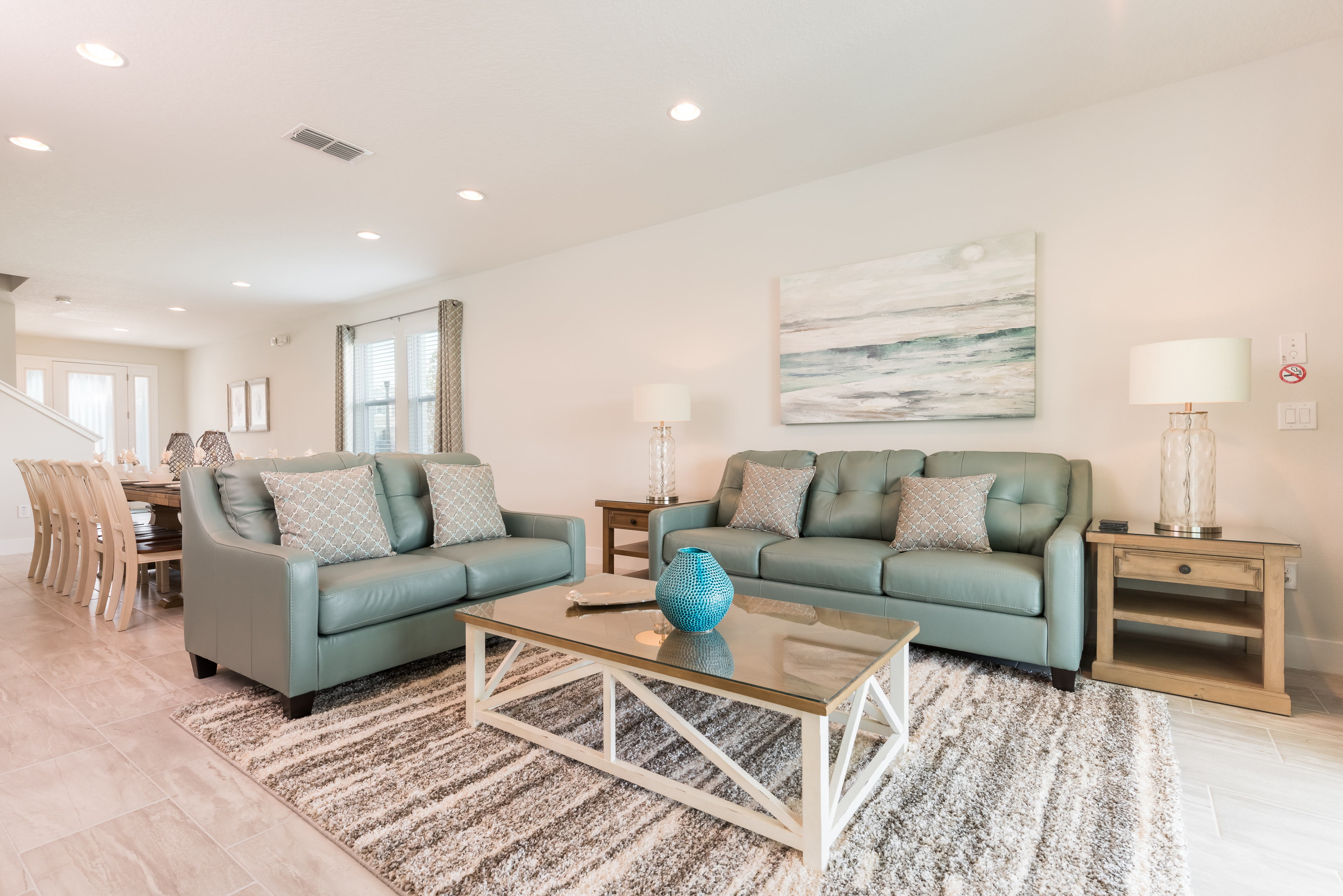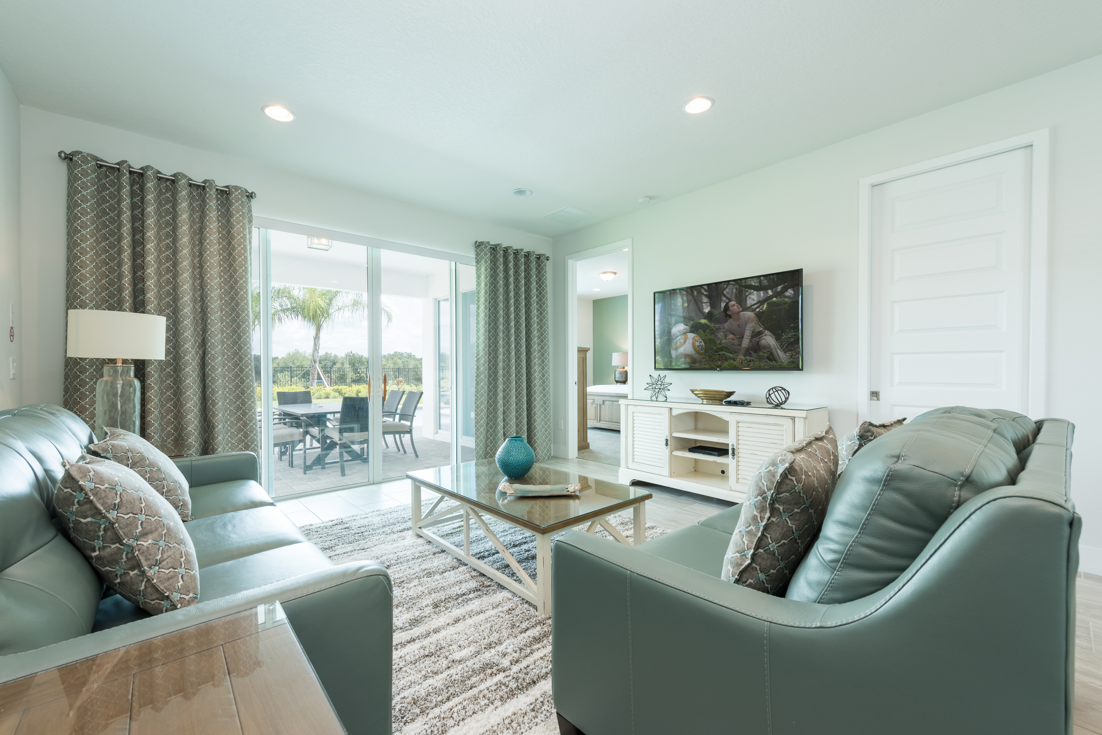 Spacious comfortable seating area with a leather sofa and loveseat overlooking the private pool deck through sliding glass doors
