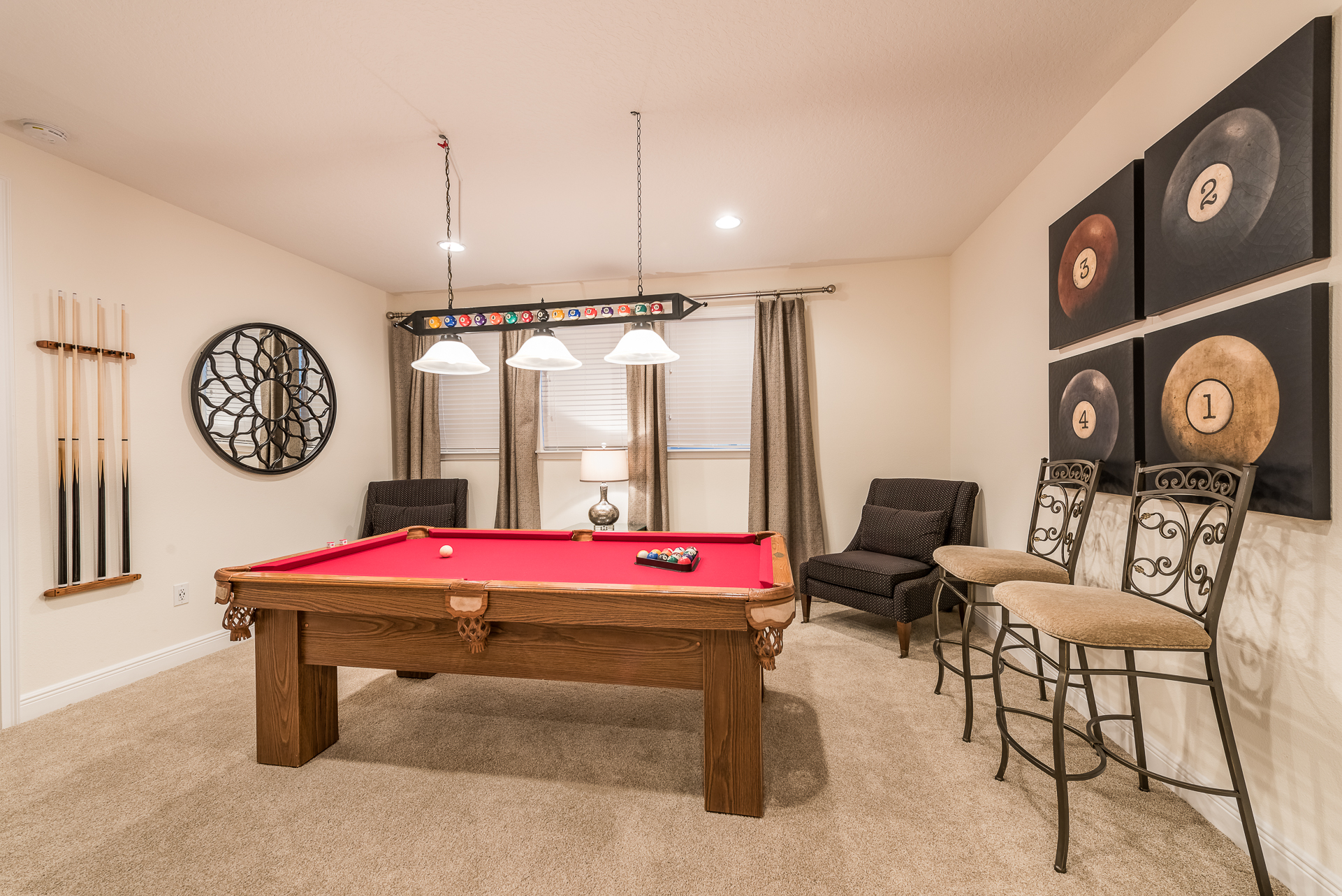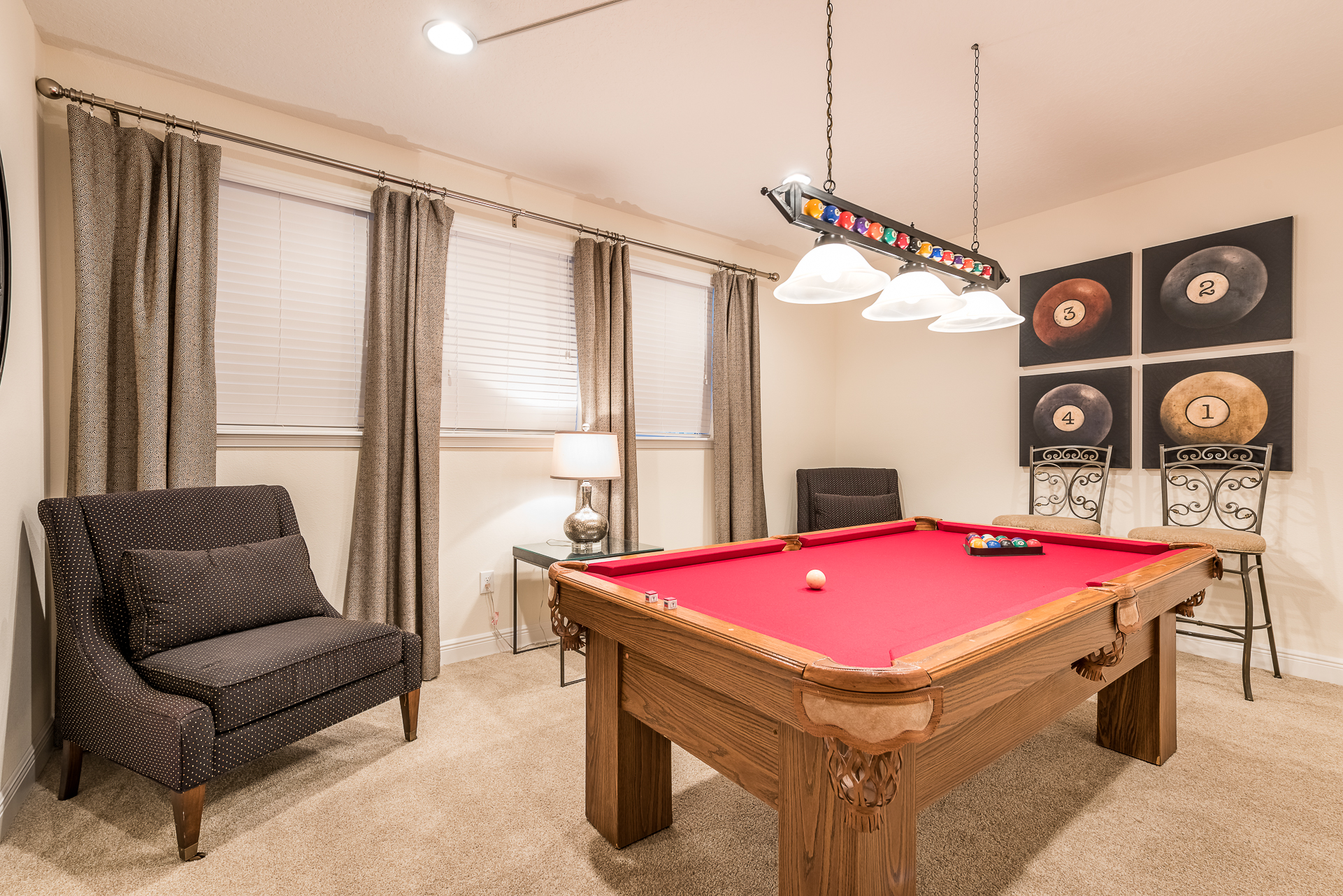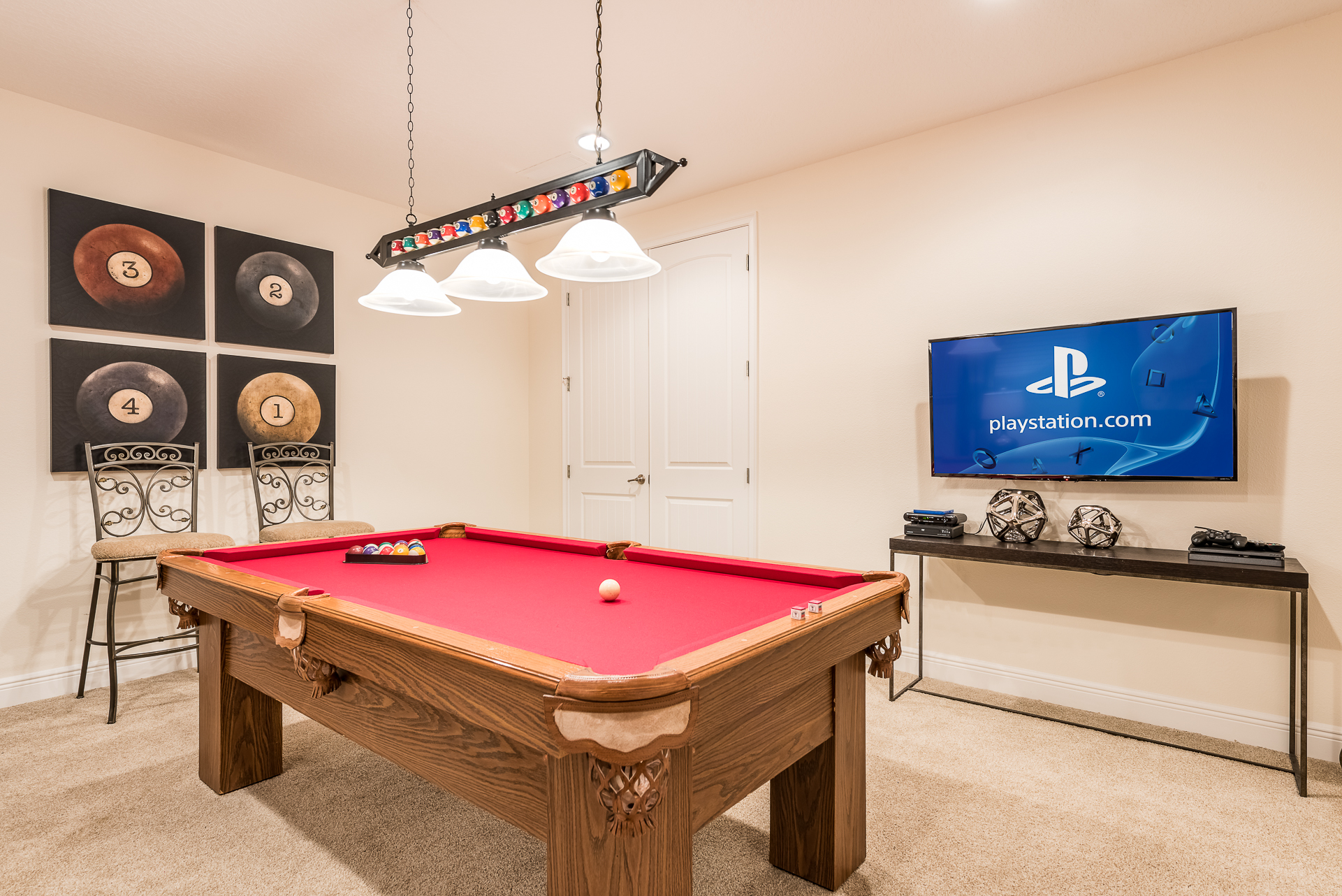 Upper floor loft area has a large flat screen TV with a PS4 video game console, pool table, 2x high seat chairs, 2x accent chairs