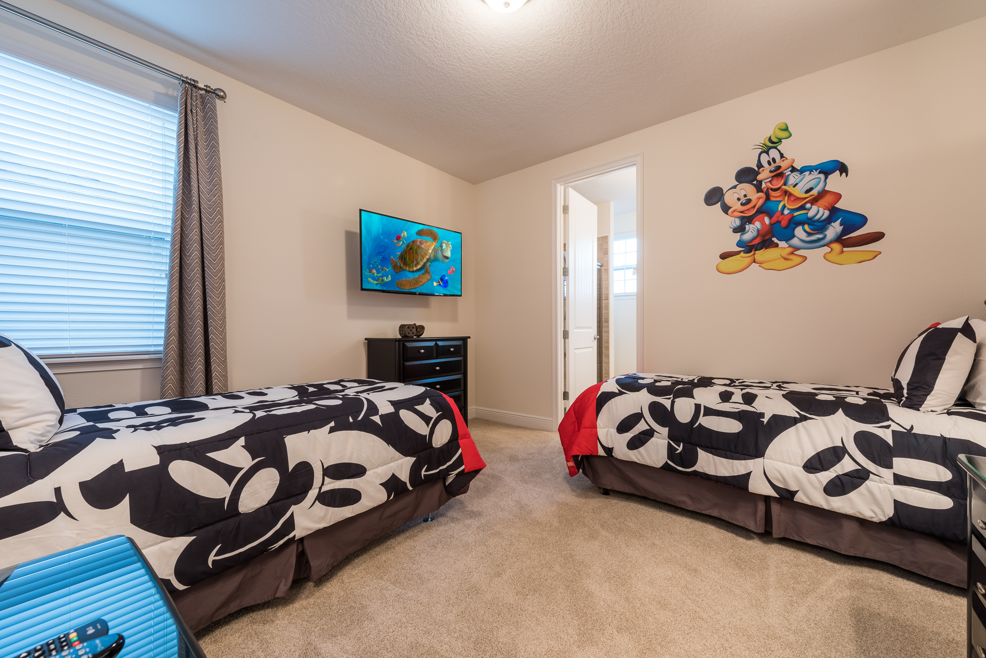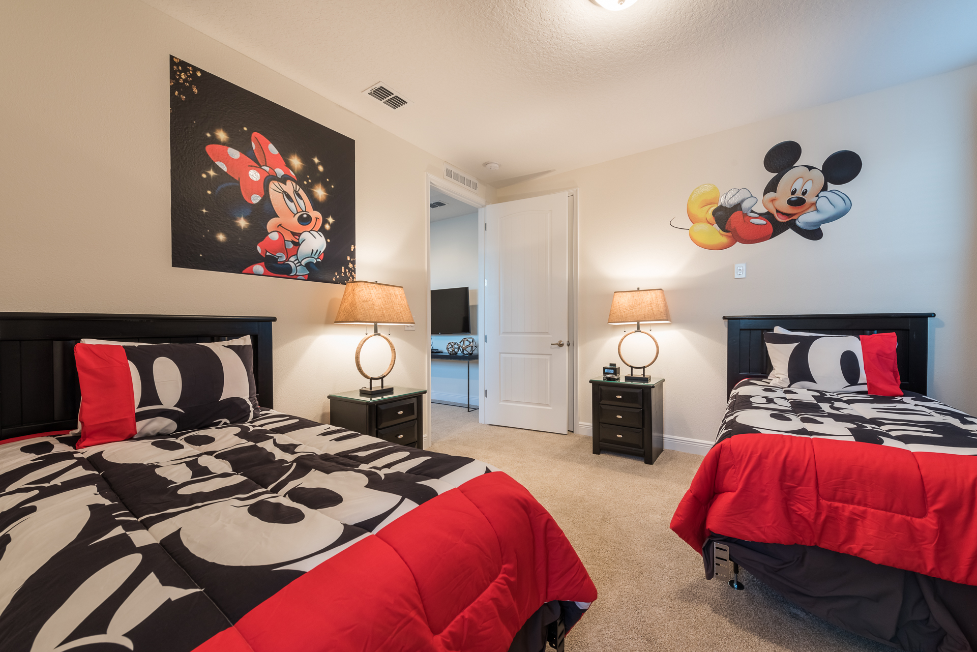 'Mickey Mouse' themed bedroom with 2x Twin sized beds and an en suite (shower), located through the loft
