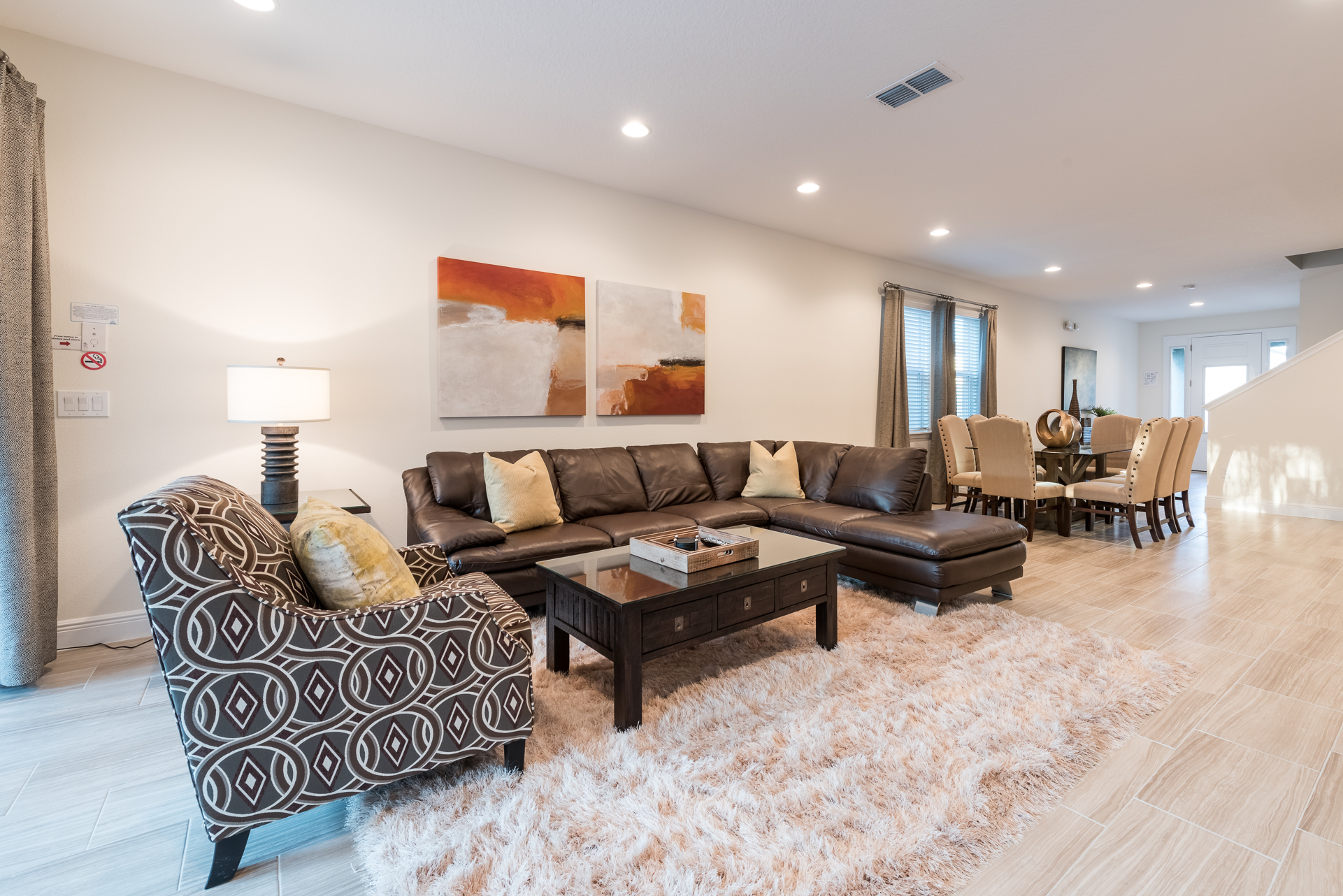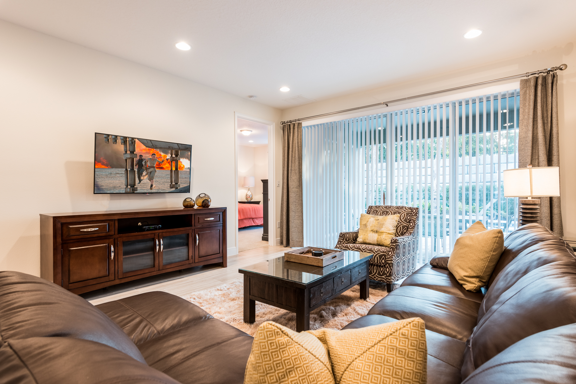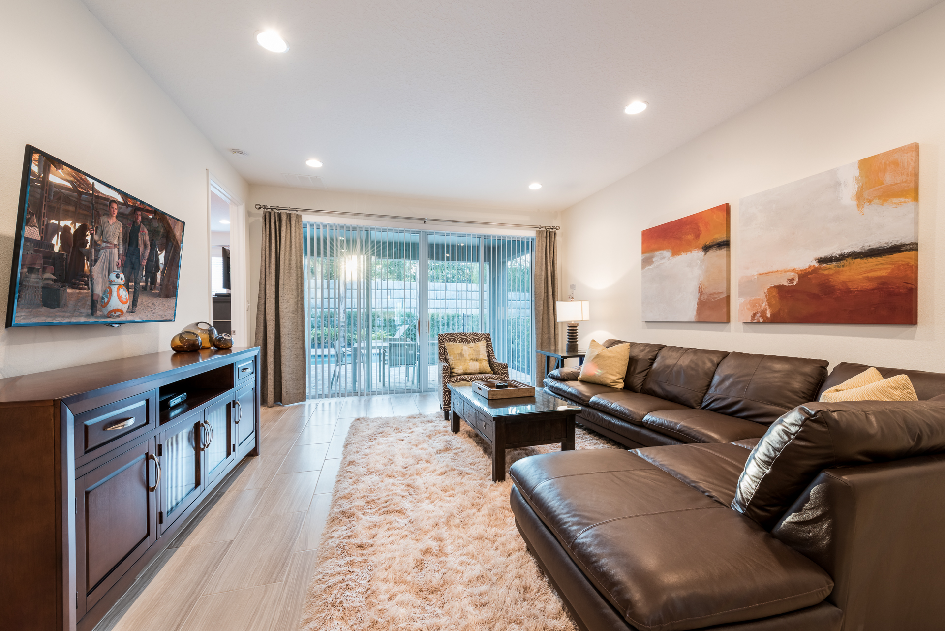 Spacious comfortable seating area with a leather sectional and an accent chair overlooking the private pool deck through sliding glass doors