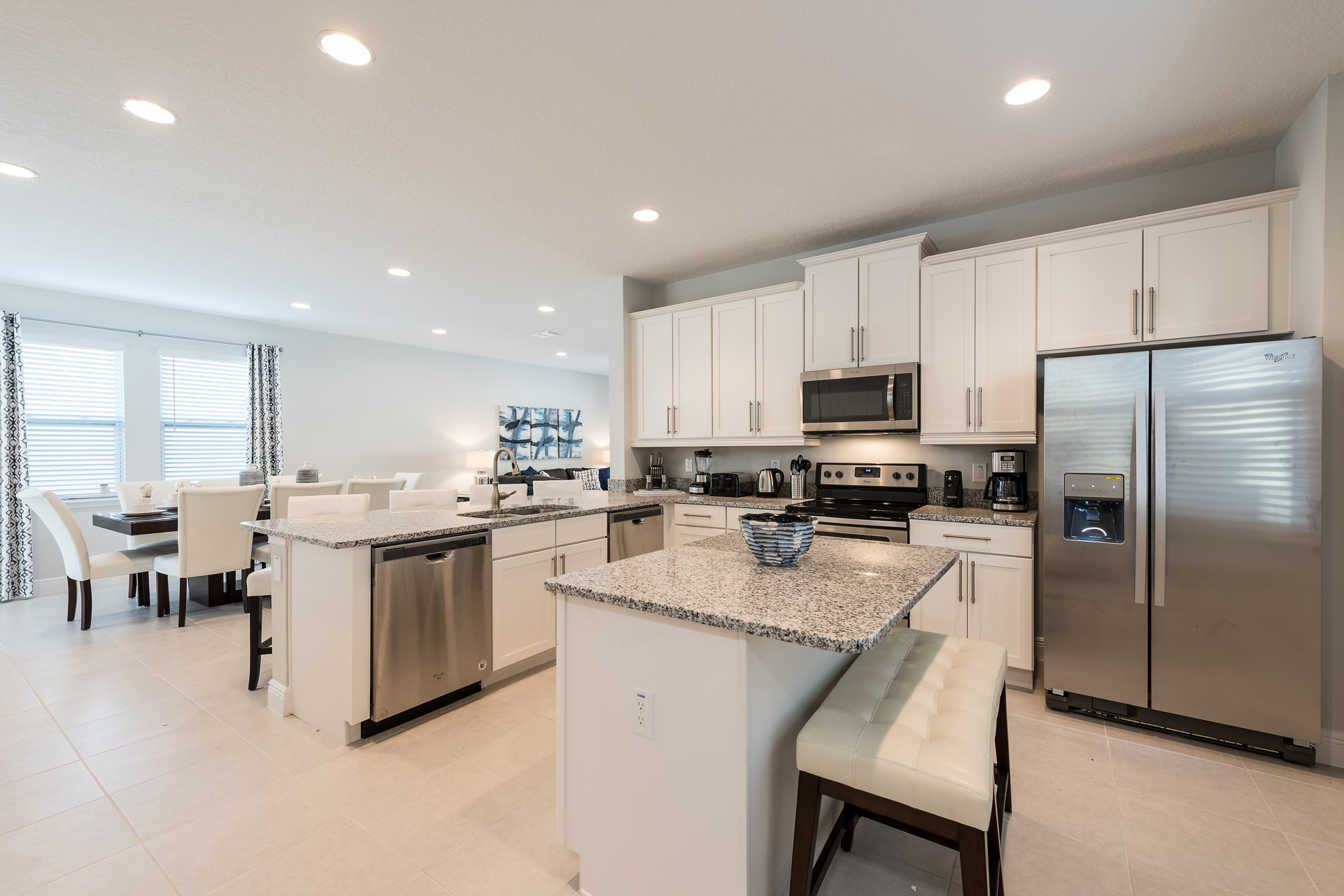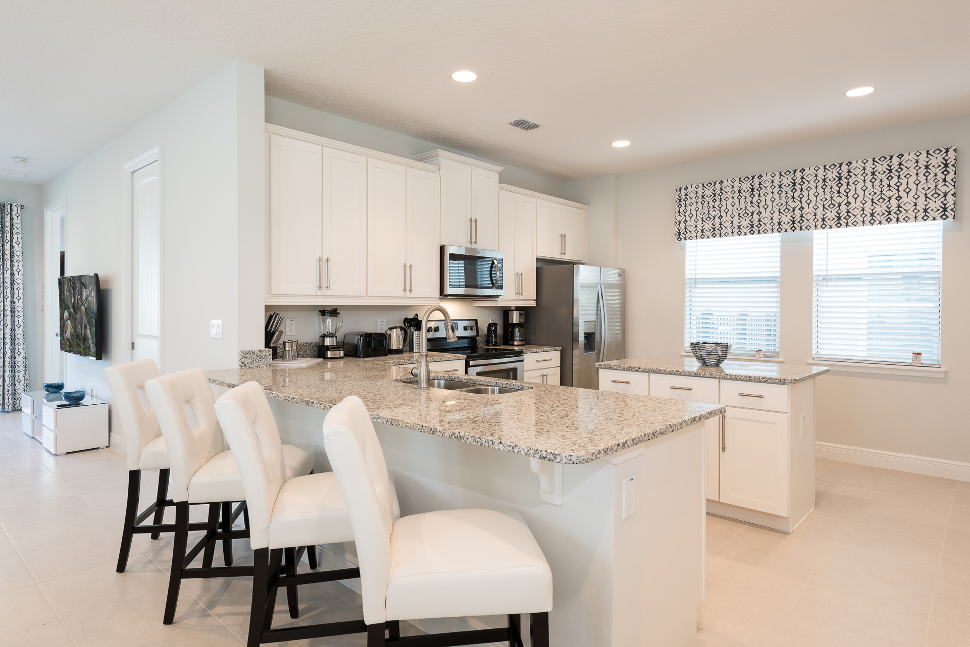 Fully equipped with a granite 4 seat breakfast bar and an island with a bench for additional seating