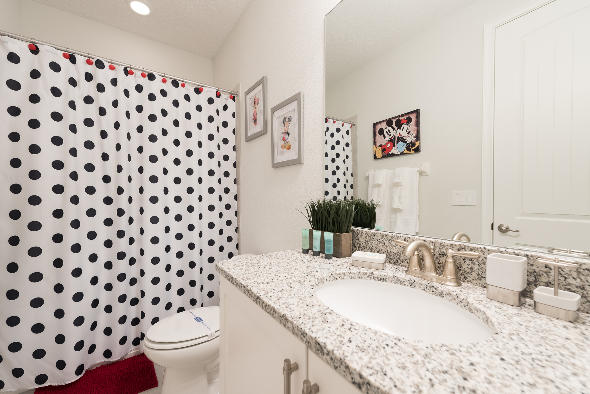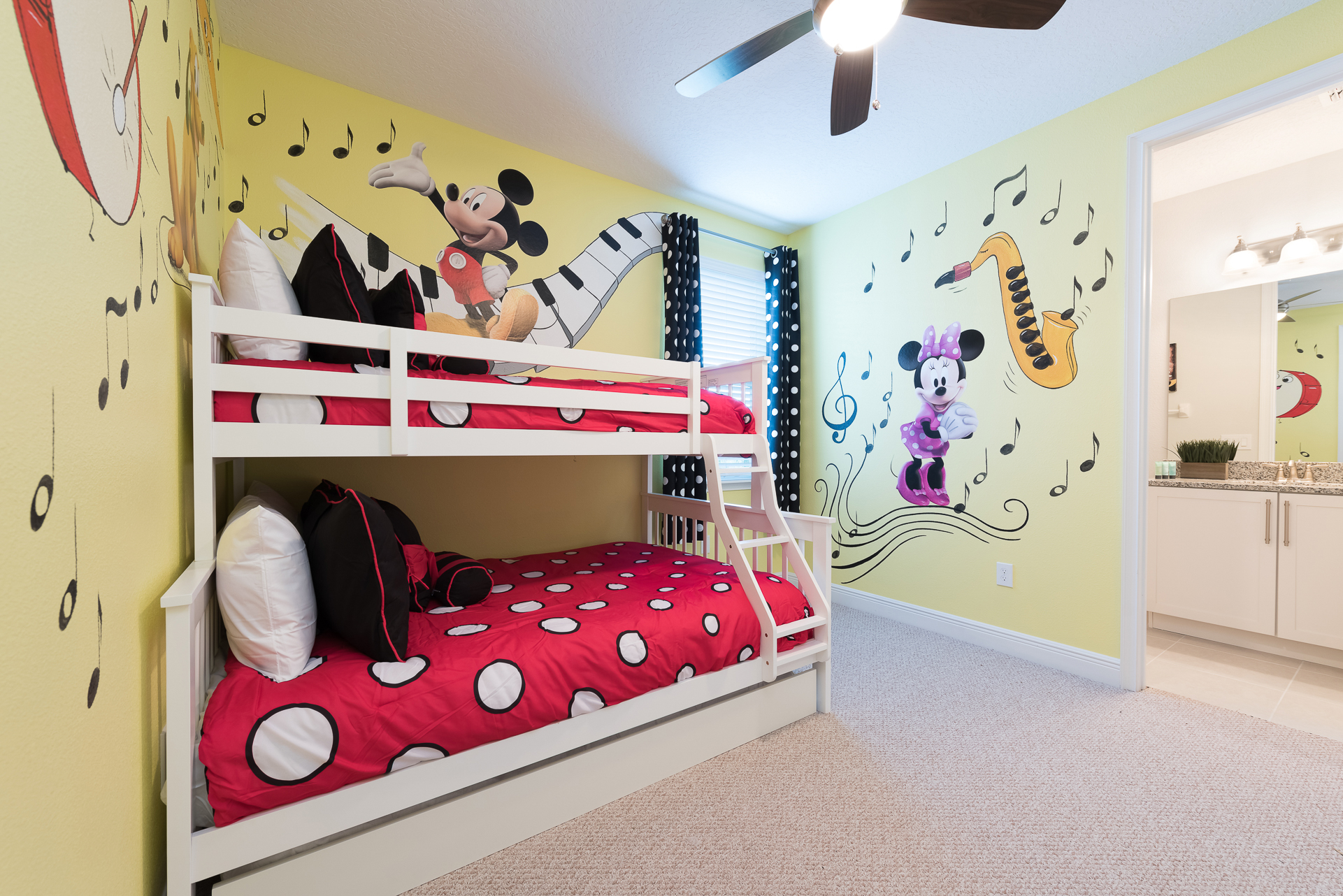 'Mickey and Minnie Mouse' themed bedroom with bunk beds (Twin/Full sized bed-additional Twin bed underneath) and an en suite (shower/bath combo)