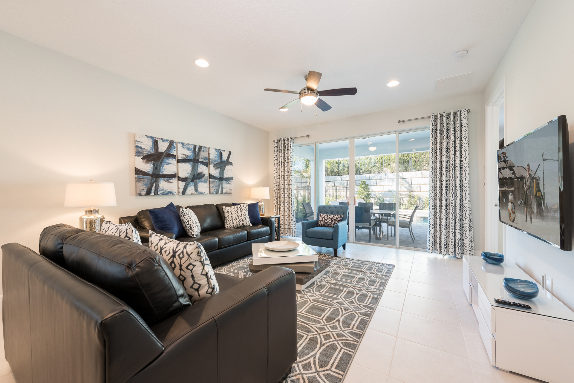 Spacious comfortable seating area with a sofa, loveseat, and accent chair overlooking the private pool deck through sliding glass doors
