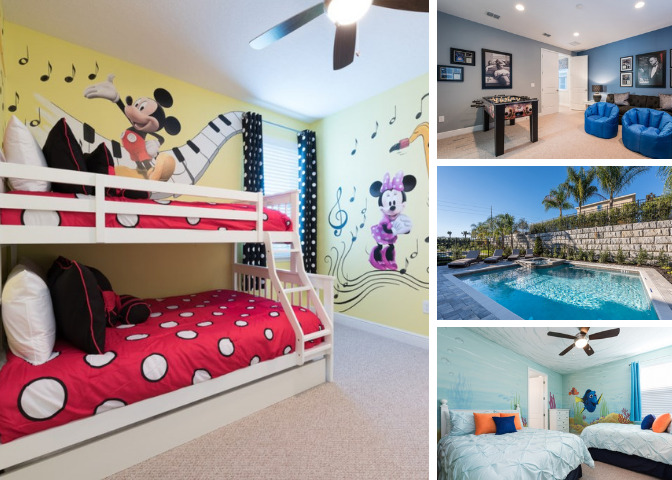 Sleeping up to 13 people, EC212 has bedrooms across both floors including 2 children's themed bedrooms such as 'Mickey and Minnie Mouse' and 'Finding Nemo'! The upper floor loft area is equipped with a foosball table and multi-arcade video game so the fun does not have to end at the parks!