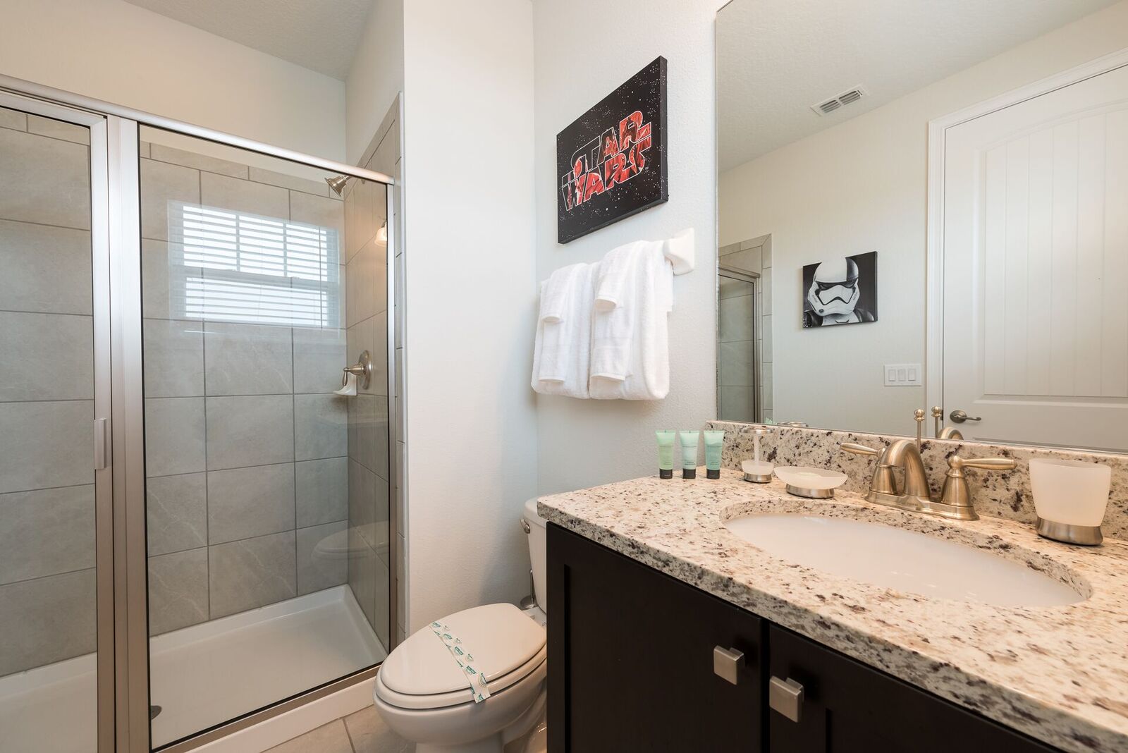 'Star Wars' themed bedroom with bunk beds (Twin and Full sized bed), 2 seat table, and en suite (shower)