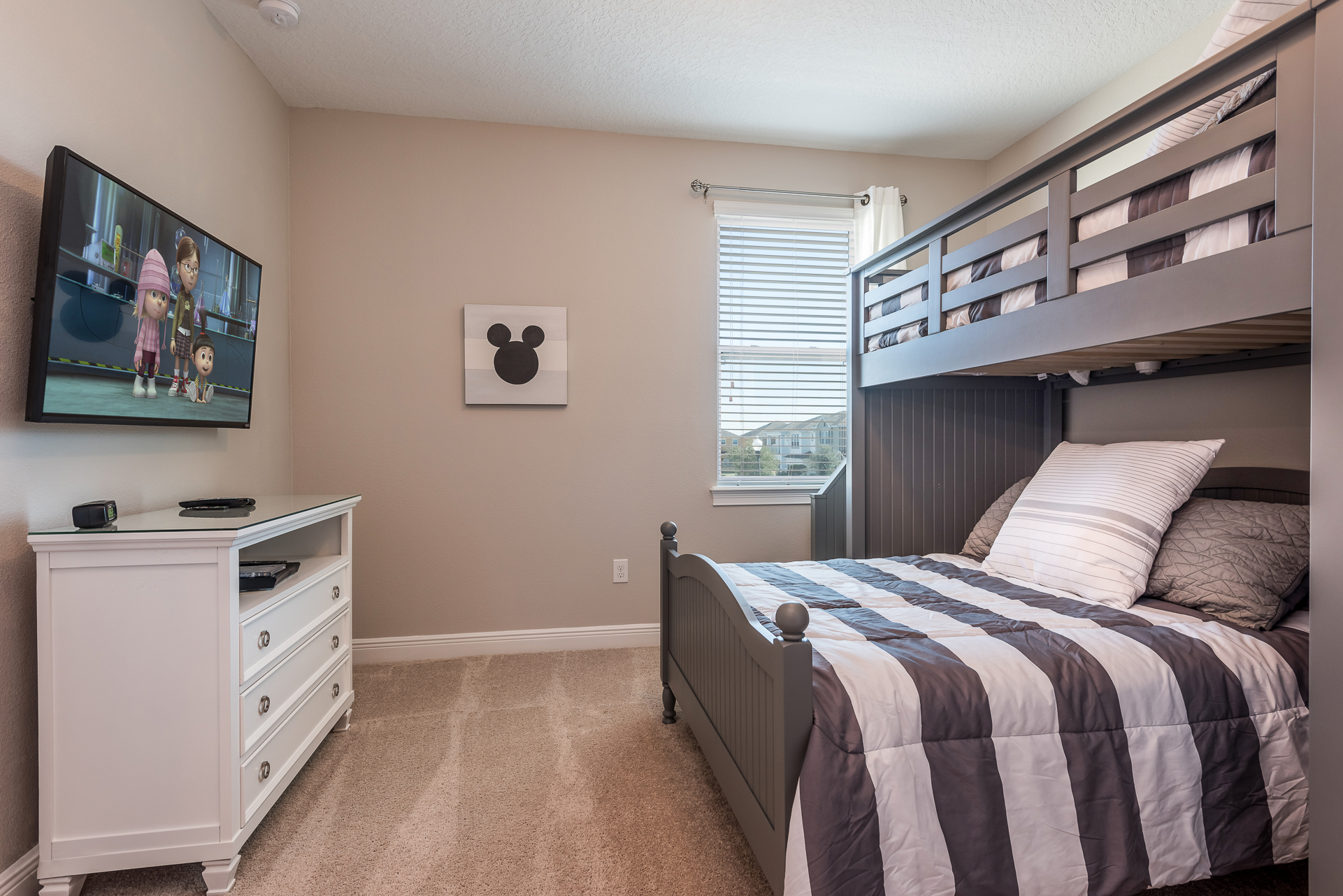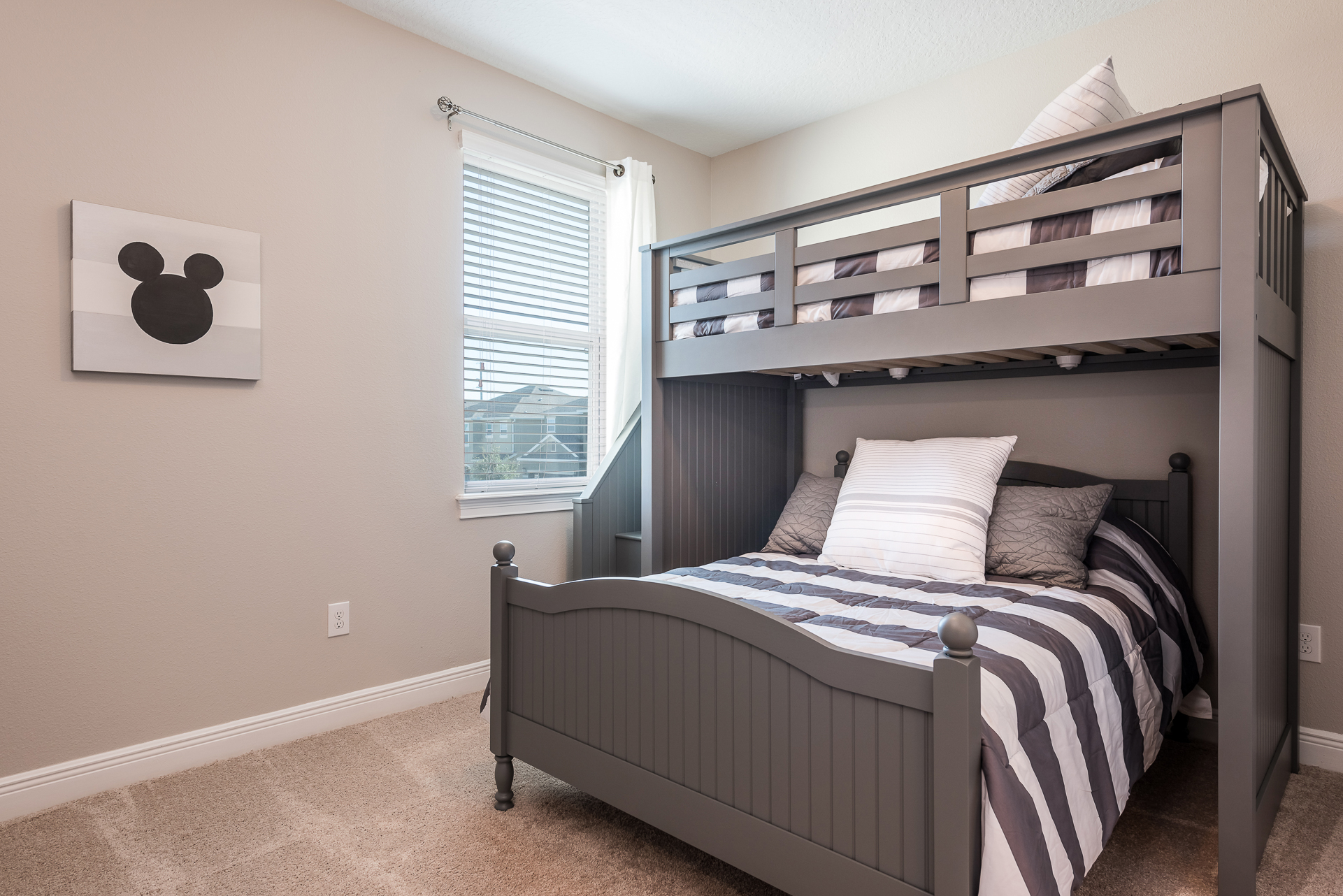 Queen sized bedroom with en suite (Jack/Jill style-shower/bath combo, twin vanities) connecting to a Safari themed bedroom with bunk beds (Twin/Full sized beds)