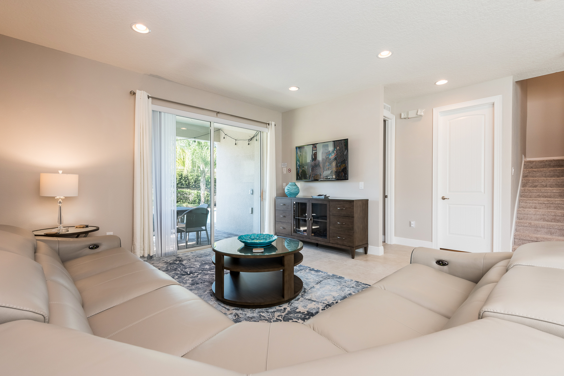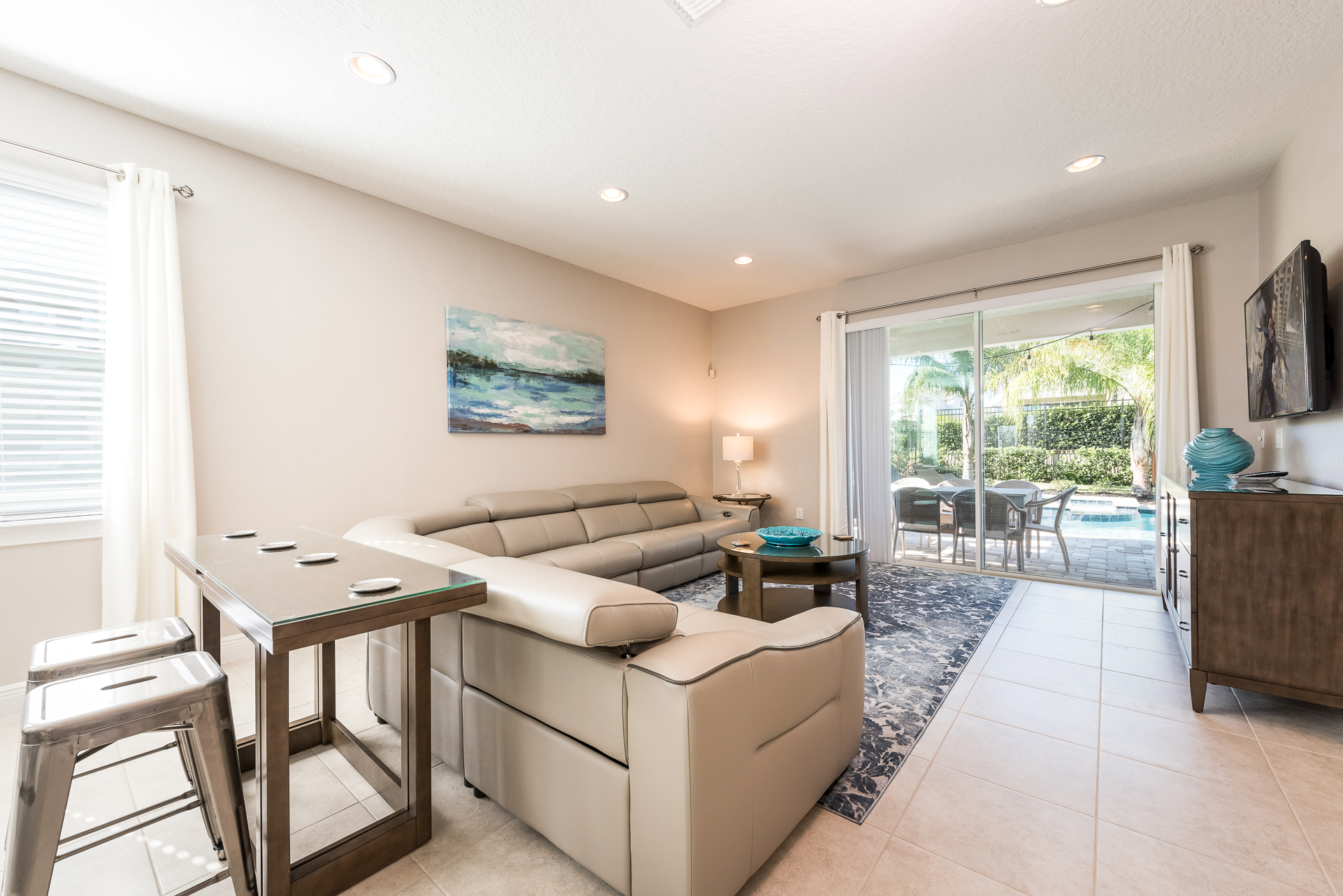 Spacious comfortable seating area with a leather reclining sectional overlooking the private pool deck through sliding glass doors