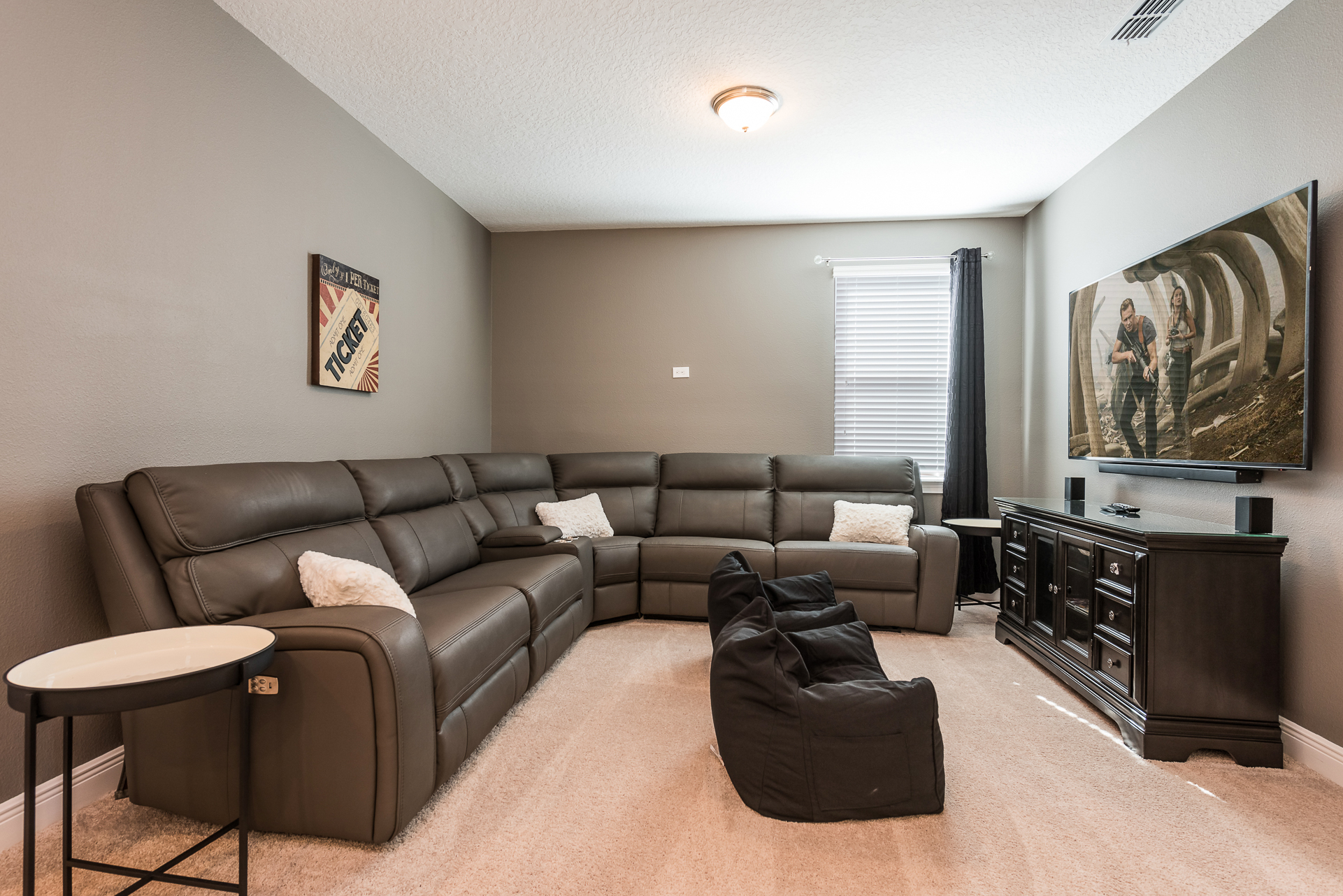 Upper floor loft area has a leather reclining sectional, large flat screen TV, and 2x bean bag chairs