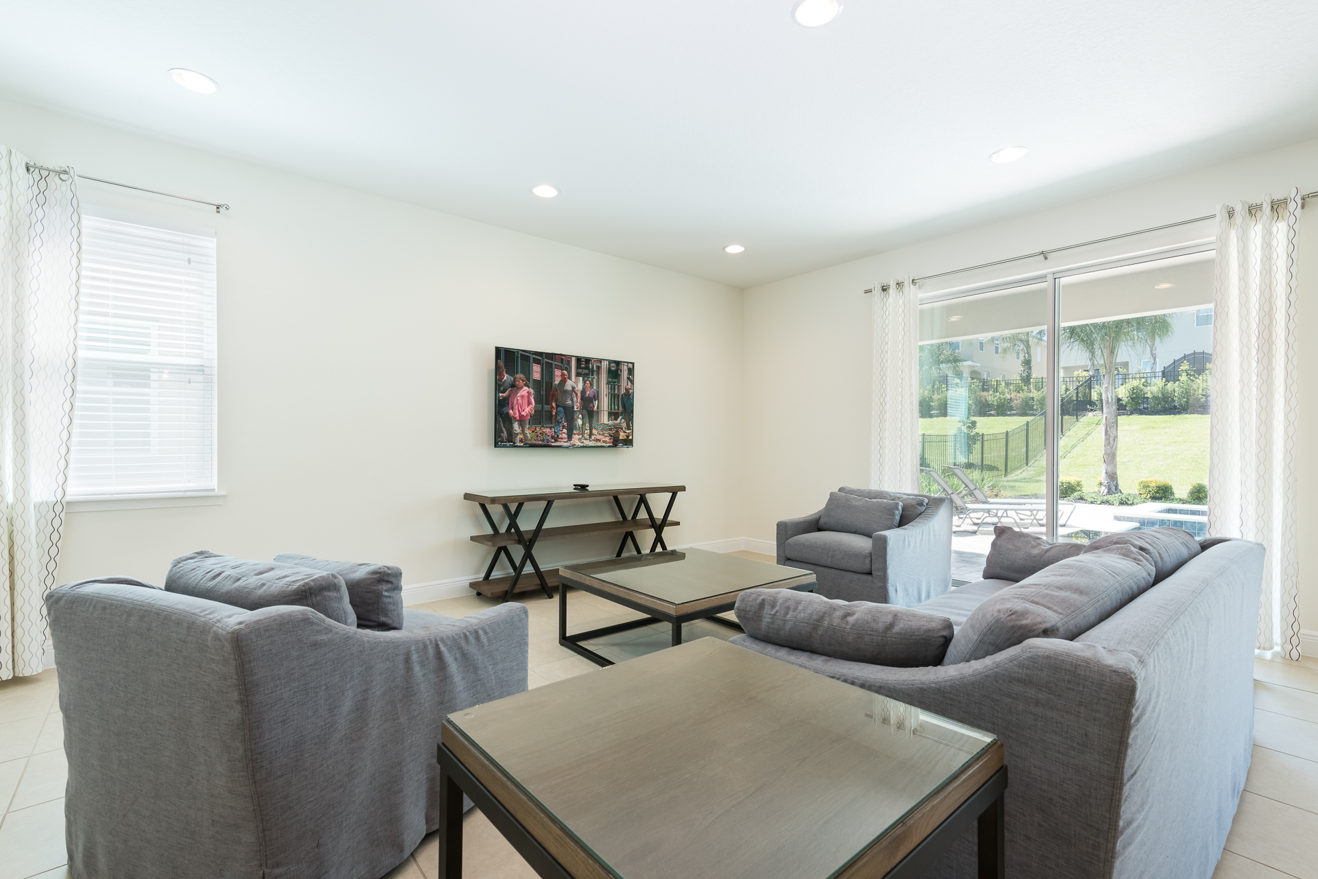 Spacious comfortable seating area with a sofa and 2x accent chairs overlooking the private pool deck through sliding glass doors