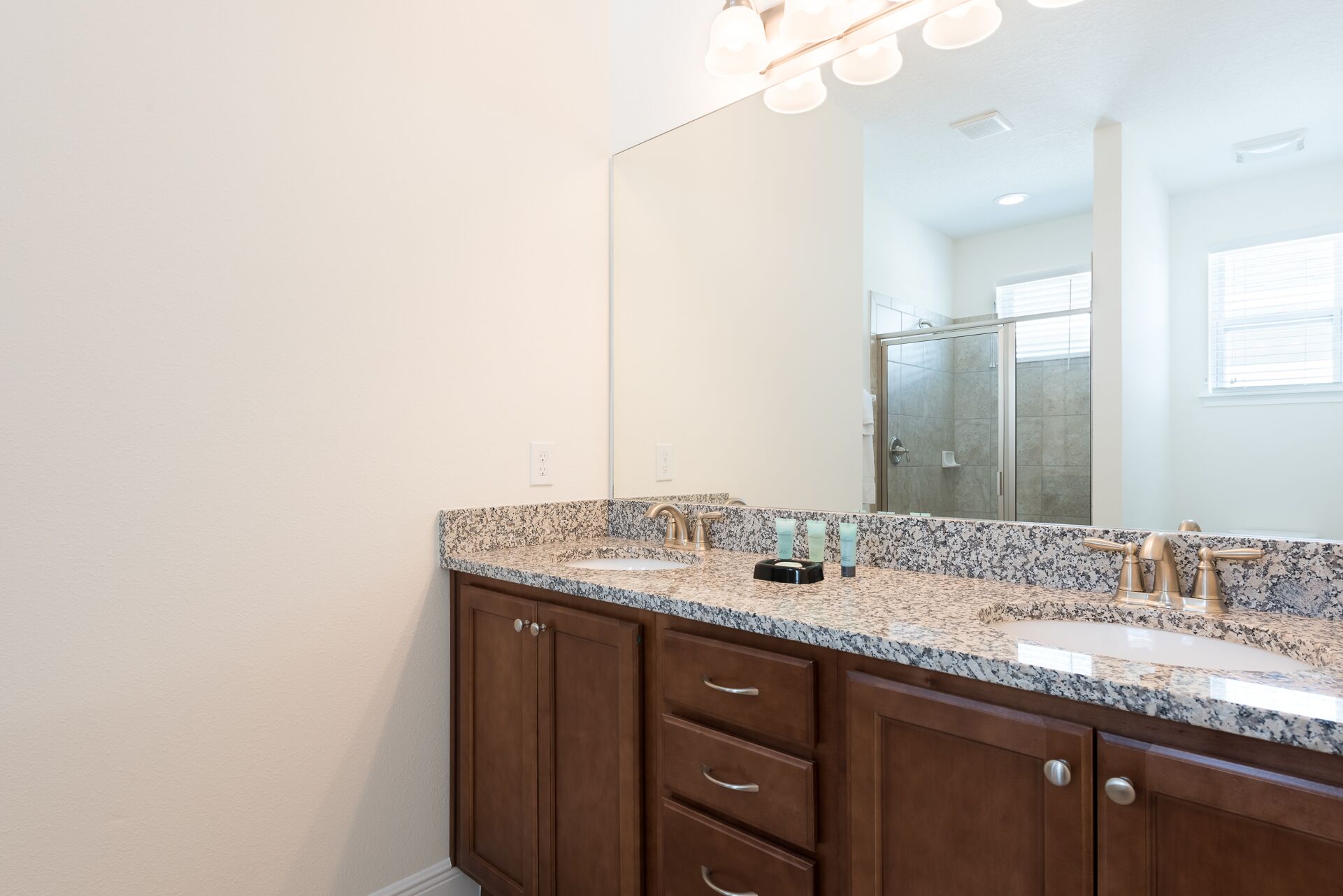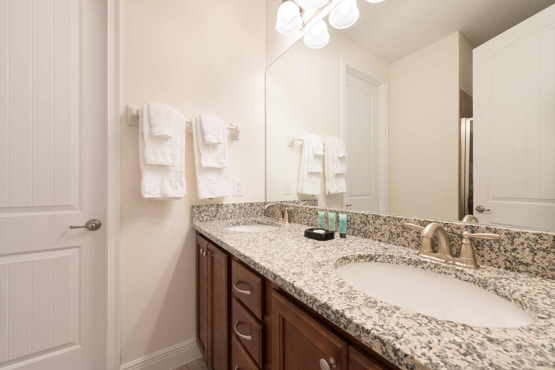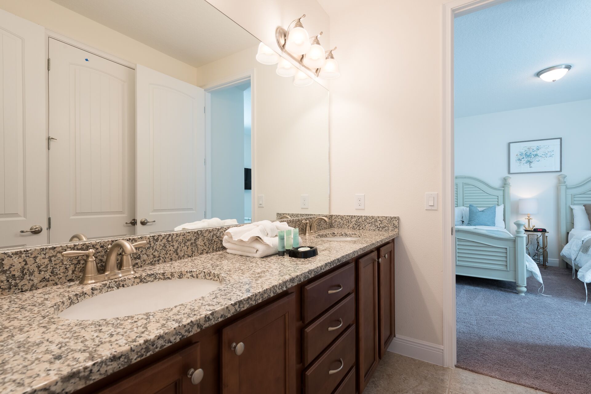 A bedroom with 2x Full sized beds and an en suite (Jack/Jill style-shower/bath combo, twin vanities) connecting to a Queen sized bedroom