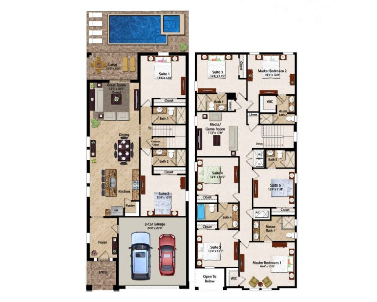 Sleeping up to 16 people, EC218 has bedrooms across both floors including 4 king sized bedrooms. Your vacation home also has the added bonus of your very own private swimming pool and spa right outside your patio doors! The upper floor loft area also provides a foosball table!