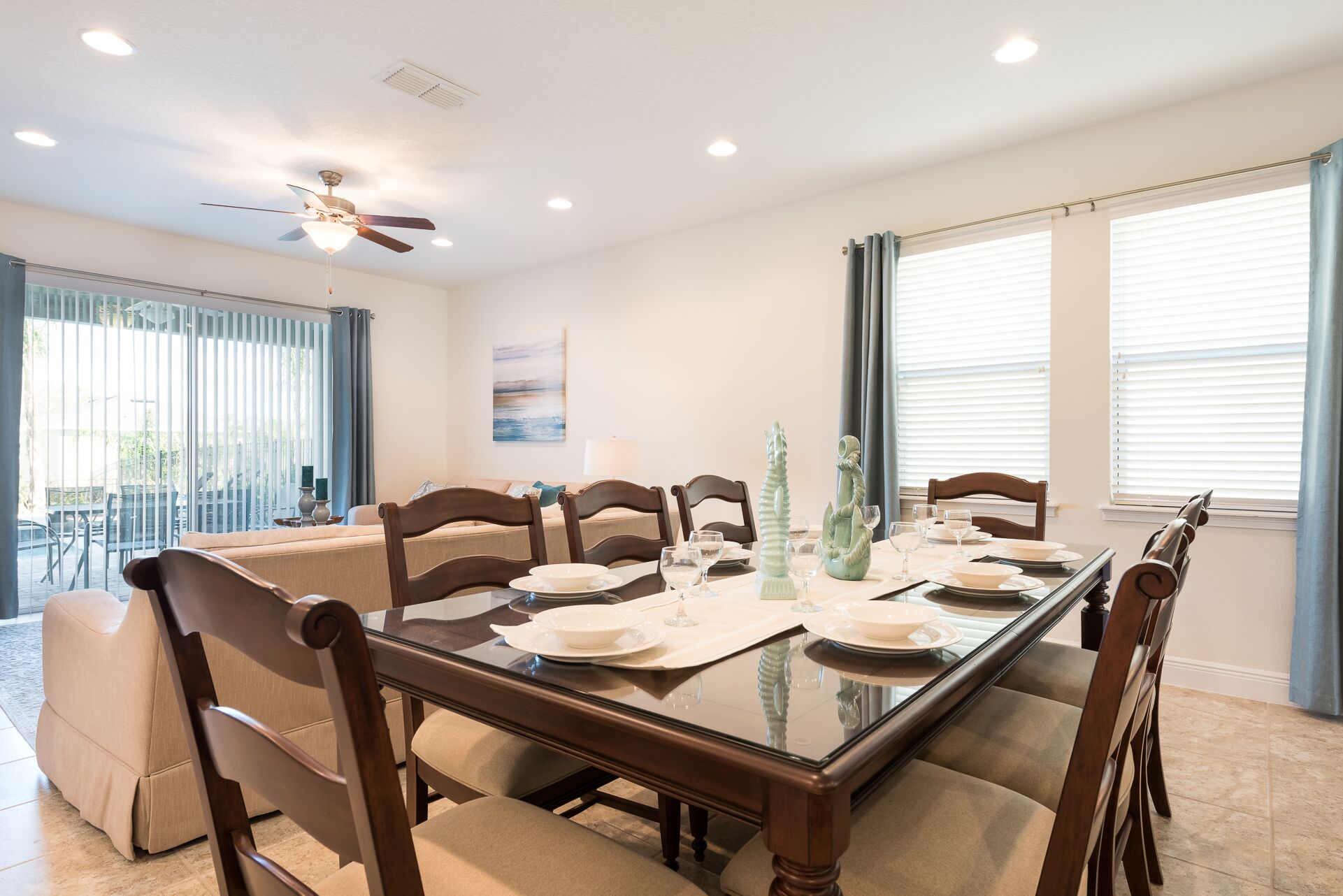 Spacious comfortable seating area with 2x sofas overlooking the private pool deck through sliding glass doors