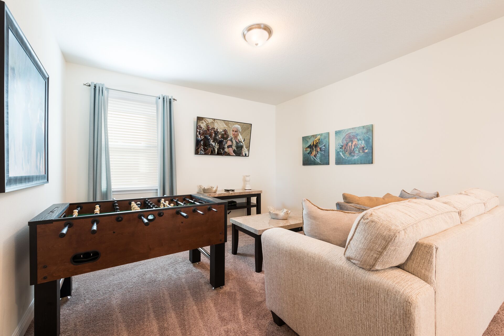 Upper floor loft area has a large flat screen TV, comfortable sofa, and a foosball table