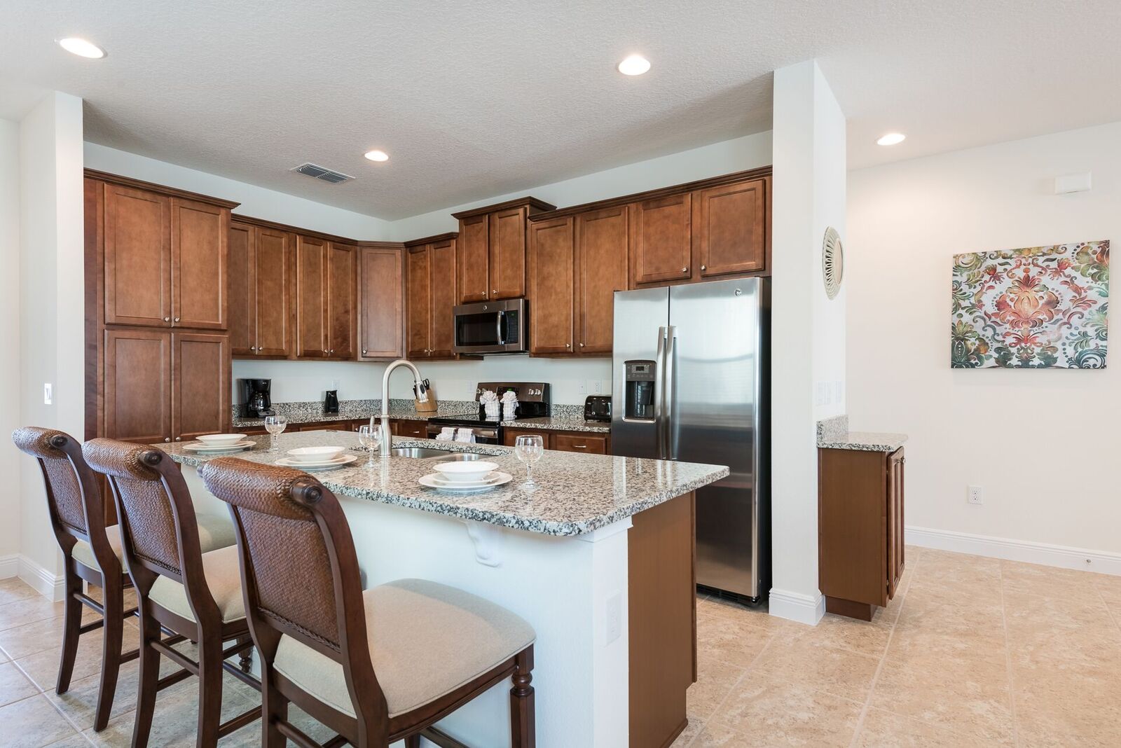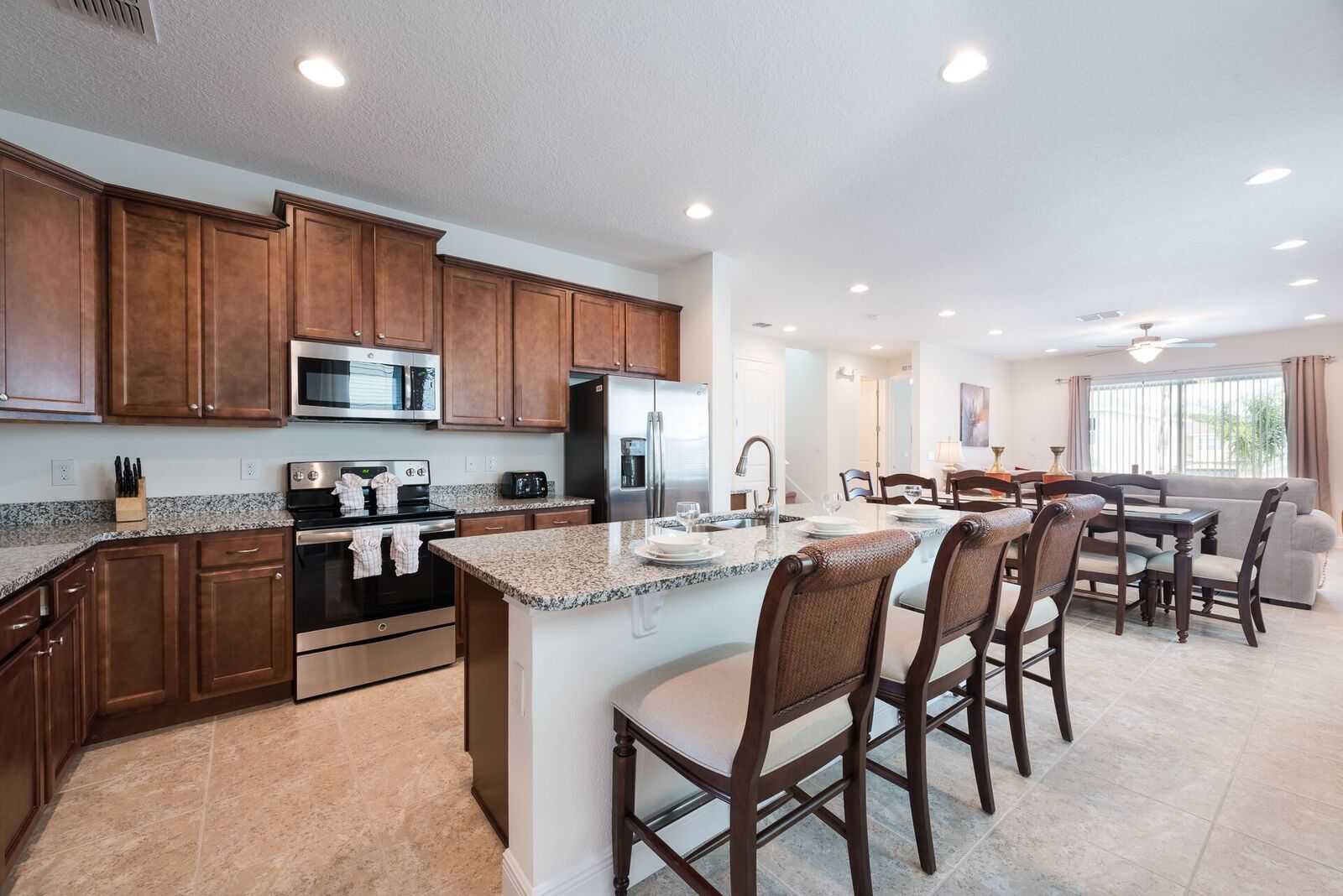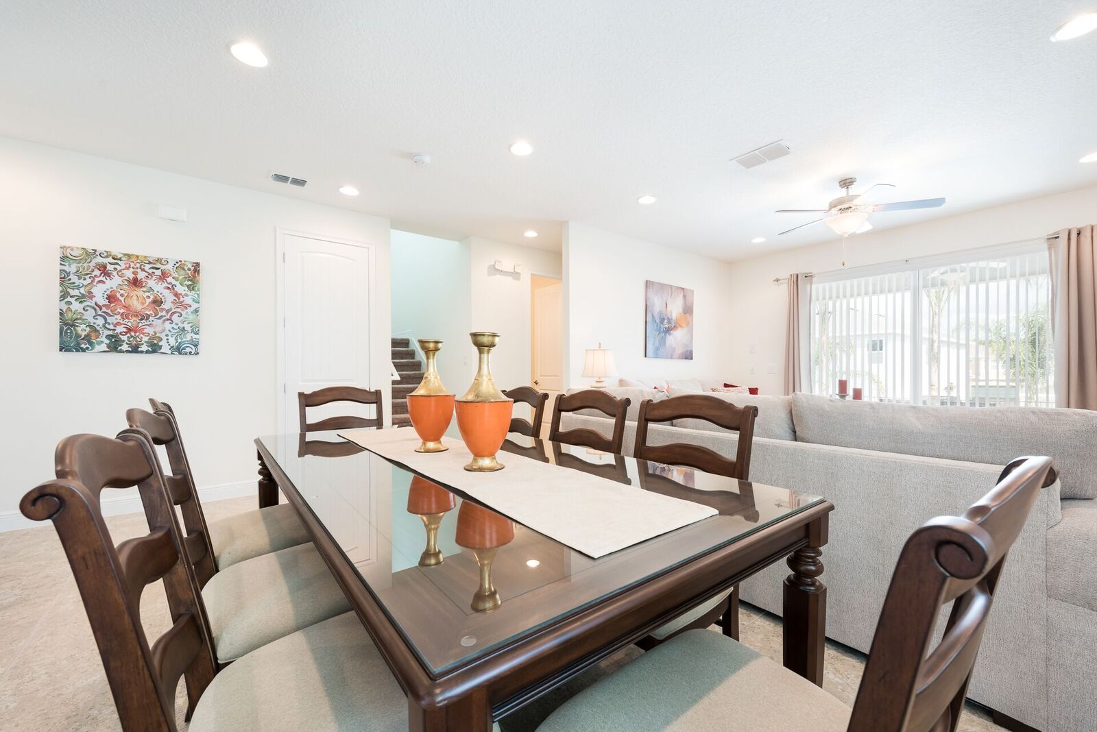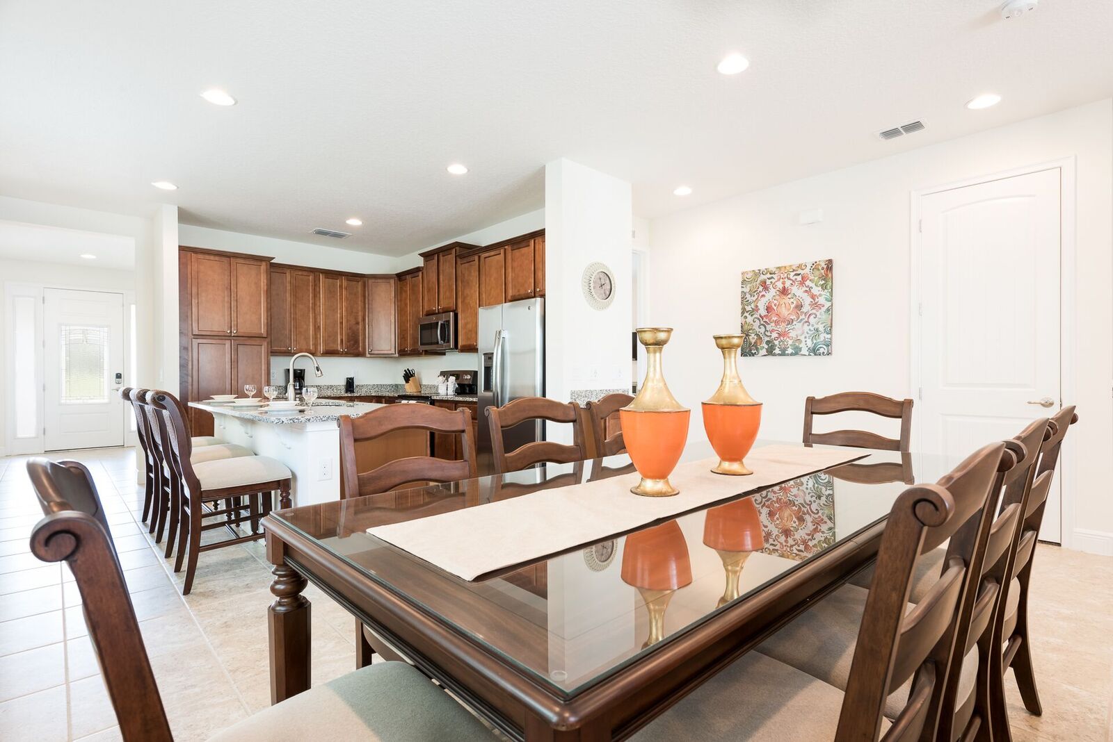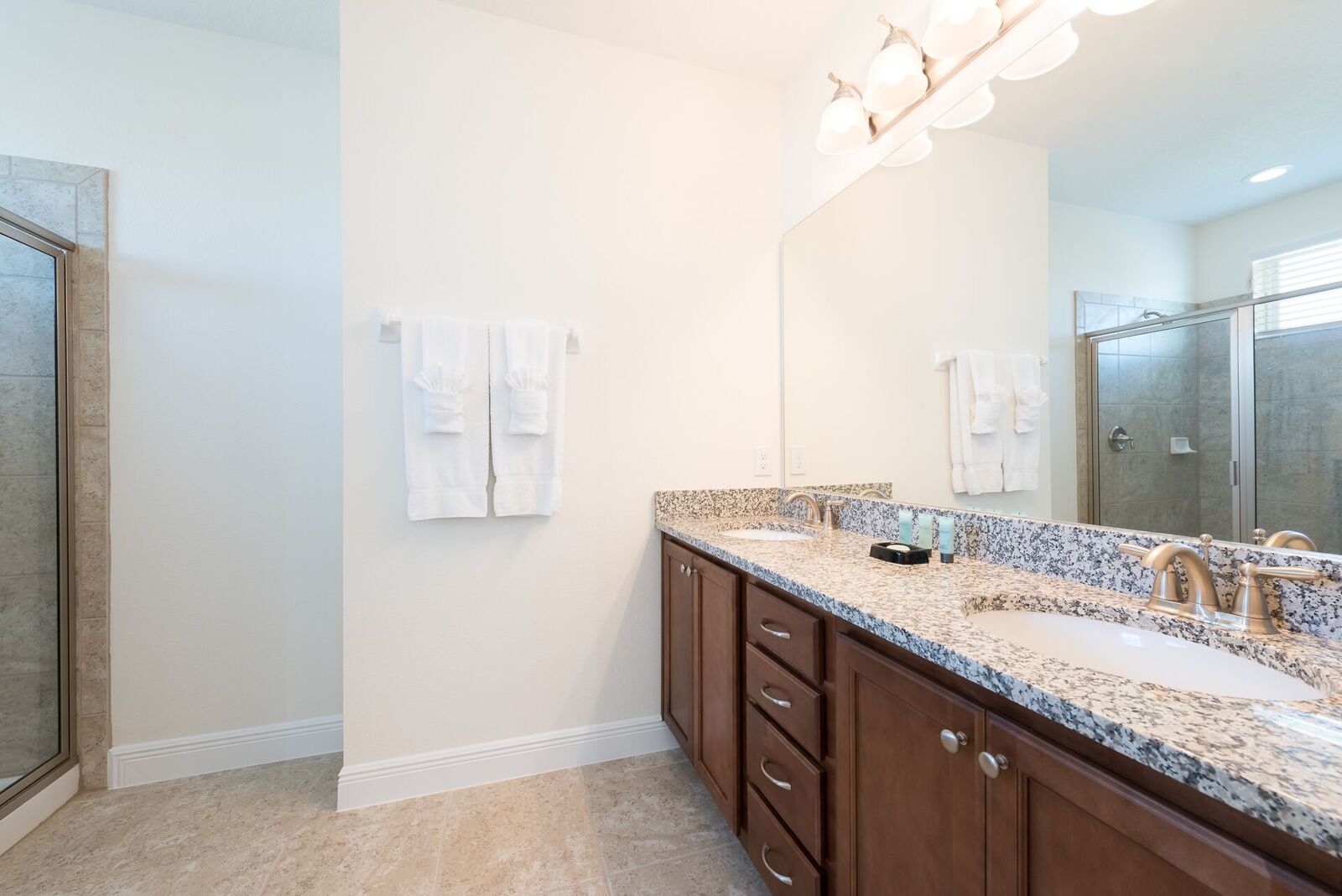 This 8 bedroom rental home, located at the Encore Club, is less than a 10 minute drive down the road to Walt Disney World! Offering 4 incredible theme parks for you and your loved ones to experience and enjoy, Disney World's proximity is only one of the many perks of staying on Encore Club property. We can't forget that the Encore Club also offers exclusive amenities right on property including a waterpark with thrilling drop and twisting slides, multiple restaurants and bars, and an amenity center with a fitness room and kid's area!