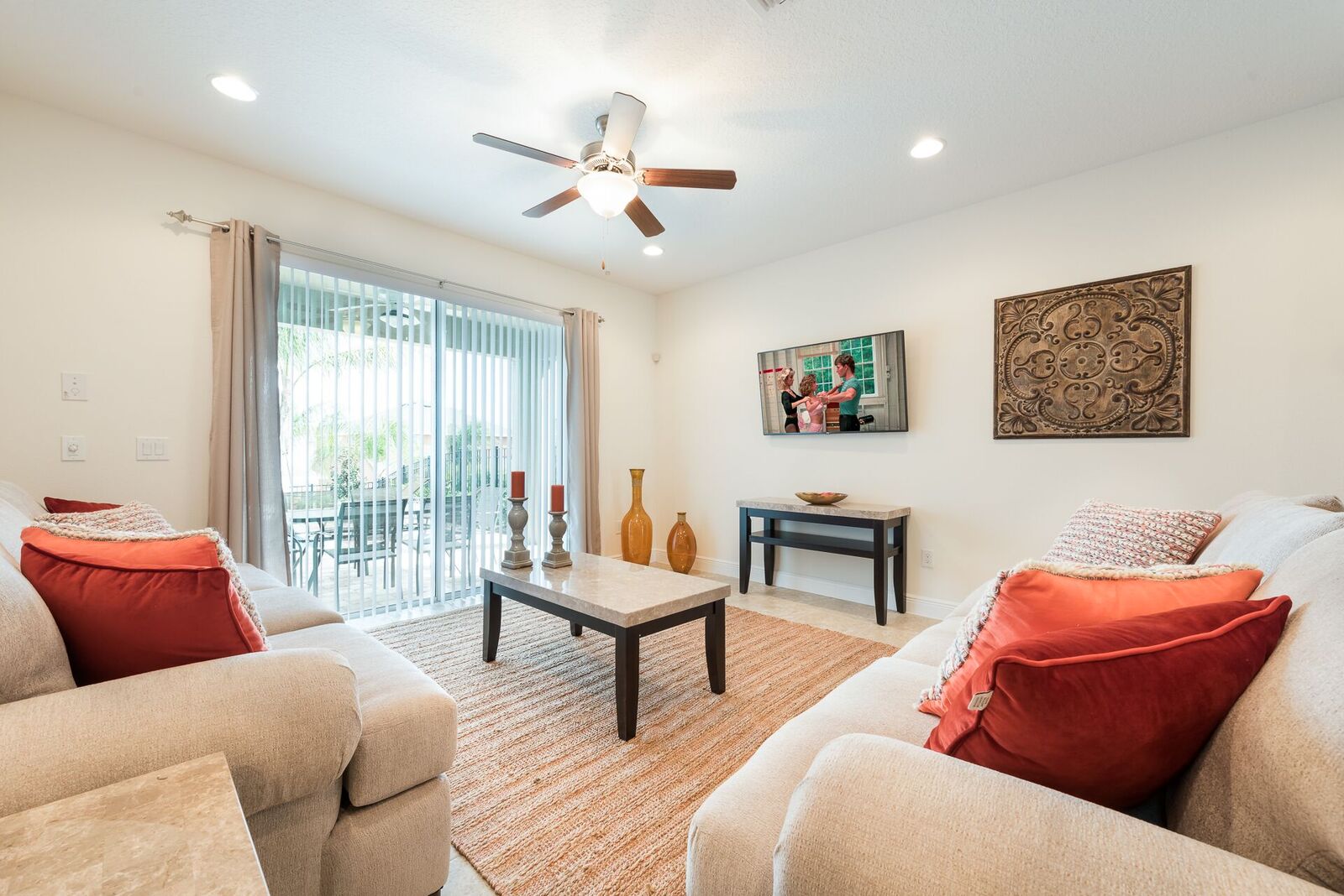 Spacious comfortable seating area with 2x sofas overlooking the private pool deck through sliding glass doors