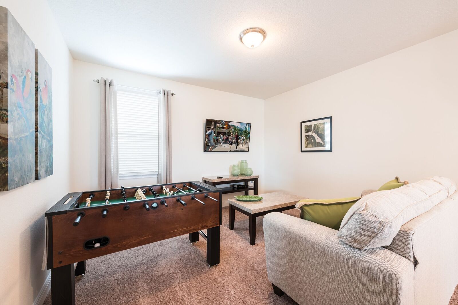Upper floor loft area has a large flat screen TV, comfortable sofa, and a foosball table