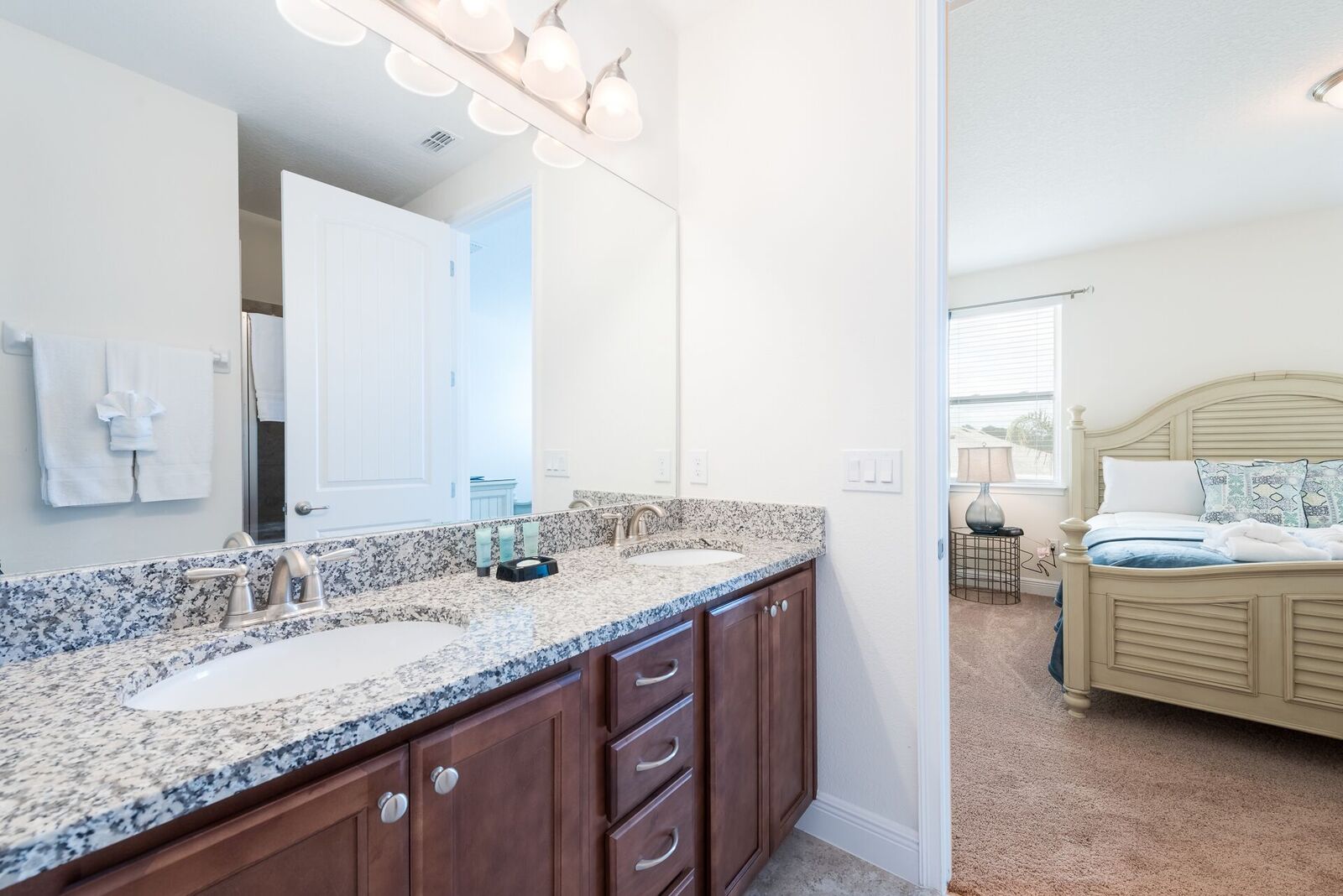 A bedroom with 2x Full sized beds and an en suite (Jack/Jill style-shower/bath combo, twin vanities) connecting to a Queen sized bedroom