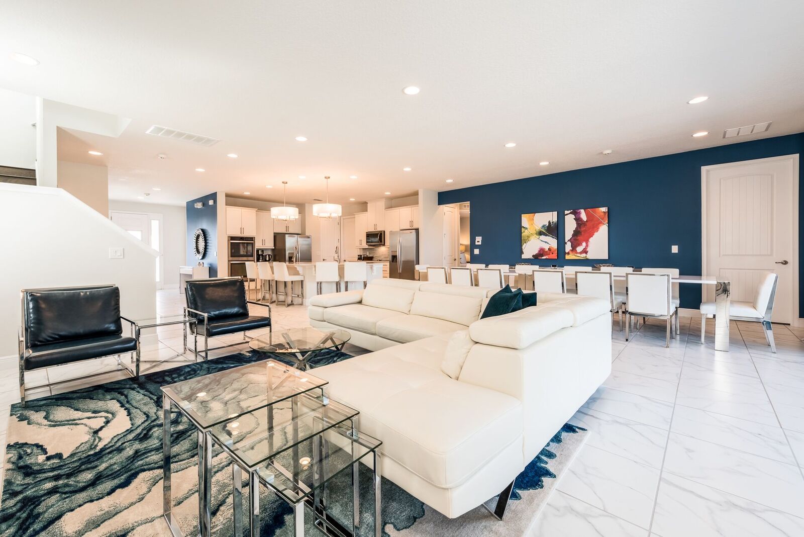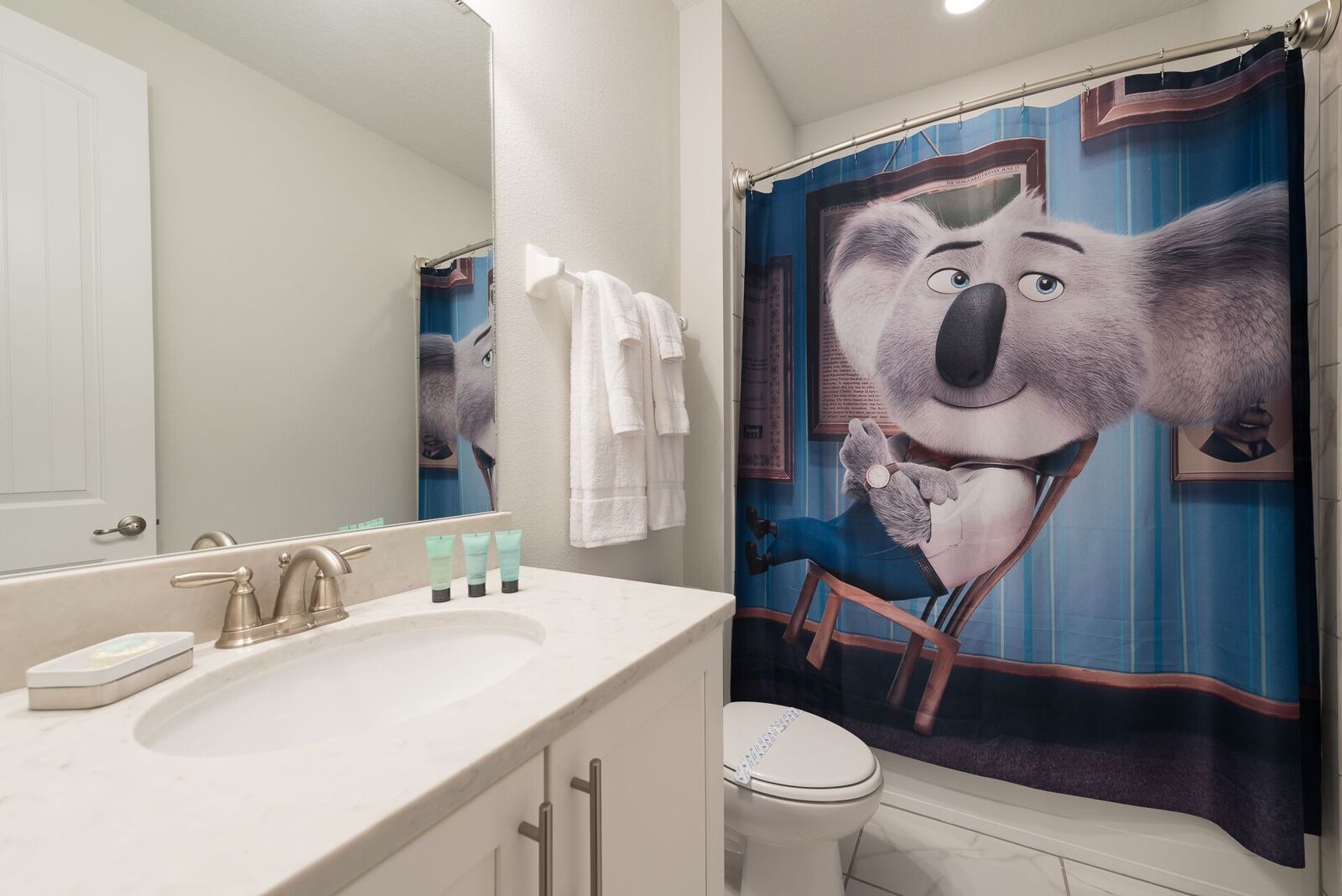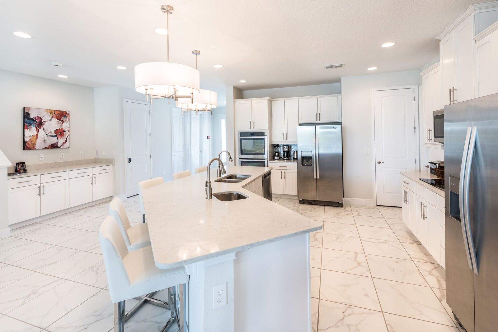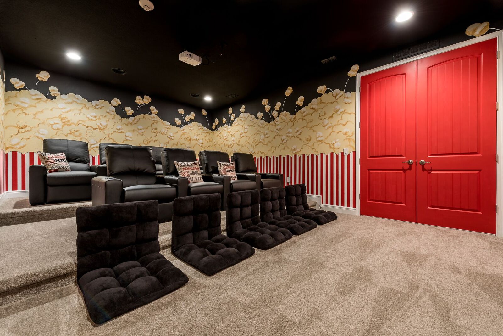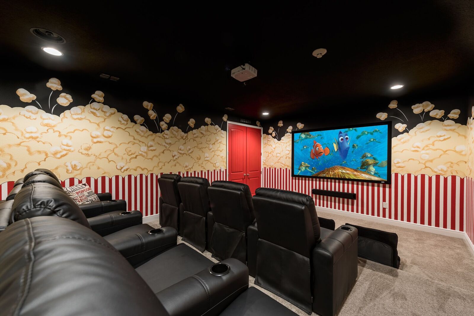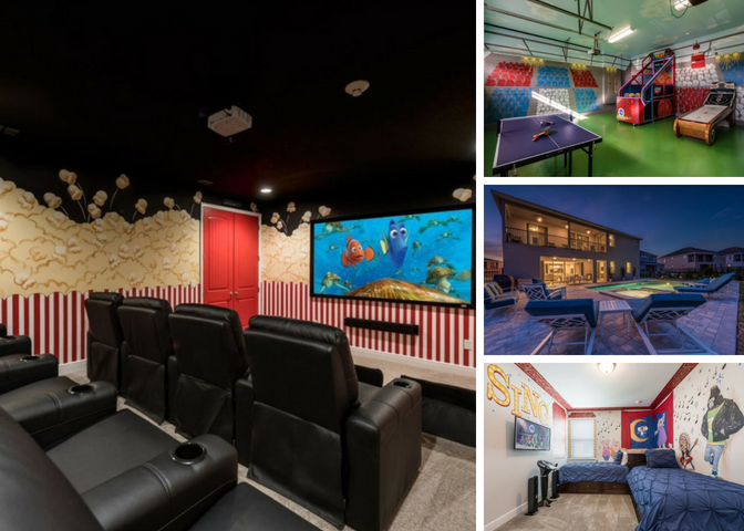Sleeping up to 23 people, EC223 has bedrooms across both floors including 3 children's themed bedrooms such as 'Sing', 'Secret Life of Pets', and 'Tangled'! The upper floor loft area is equipped with an air hockey table and multi arcade video game as well as the games room has a ping pong table, so the fun does not have to end at the theme parks! Also the home theater is the perfect place to relax and unwind after those long theme park days and watch your favorite movie on a large projection screen in theater like recliners!
