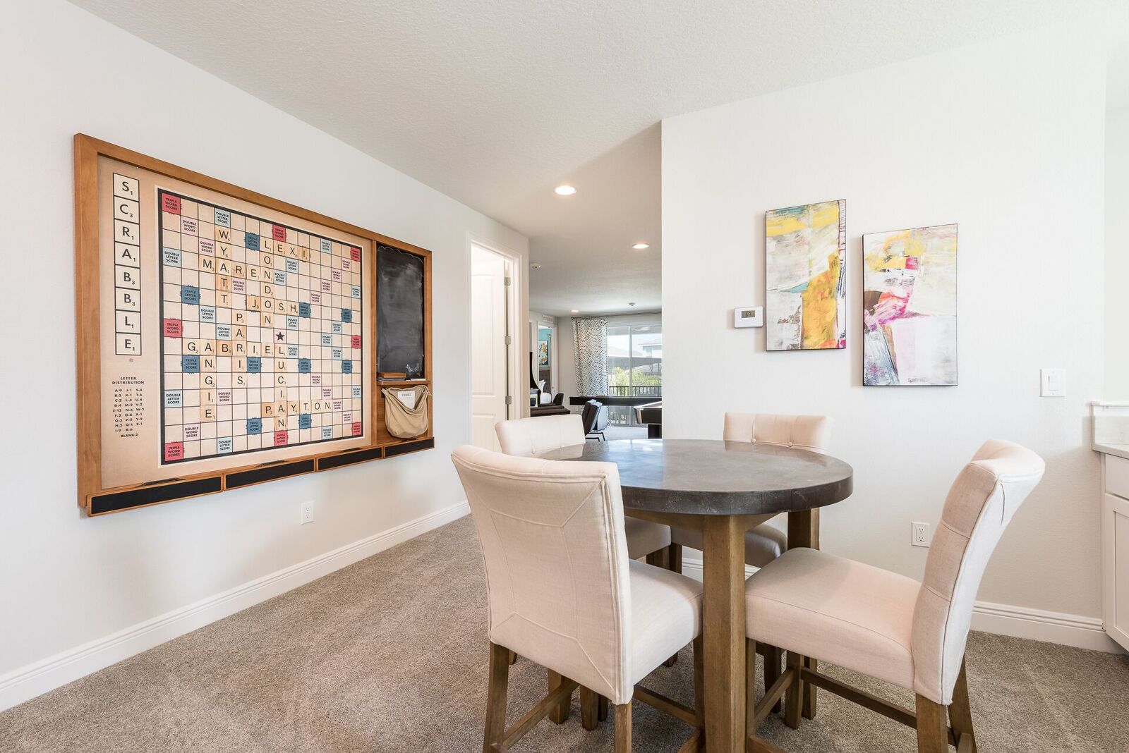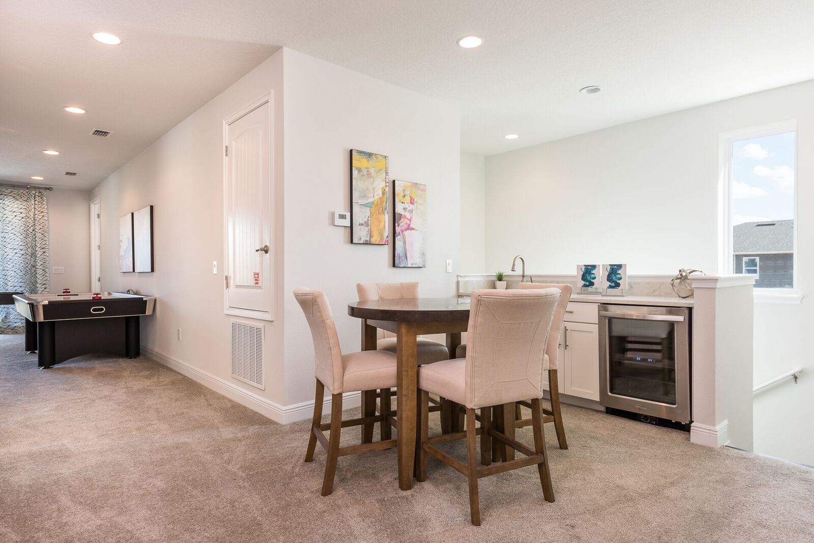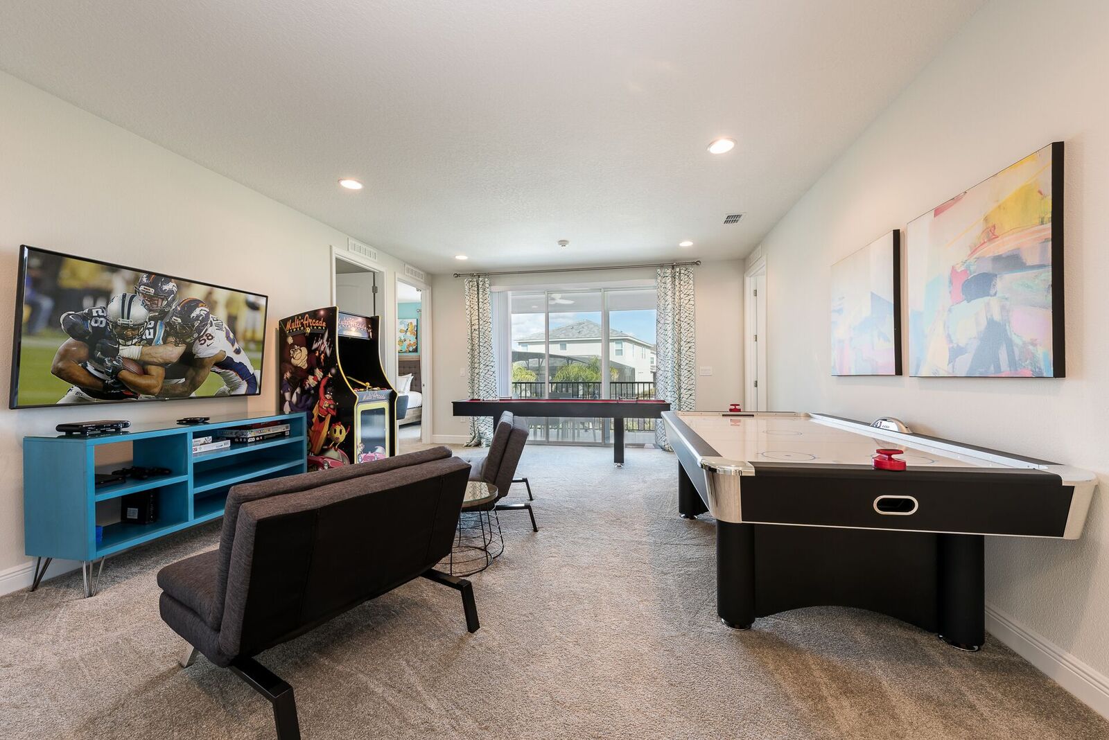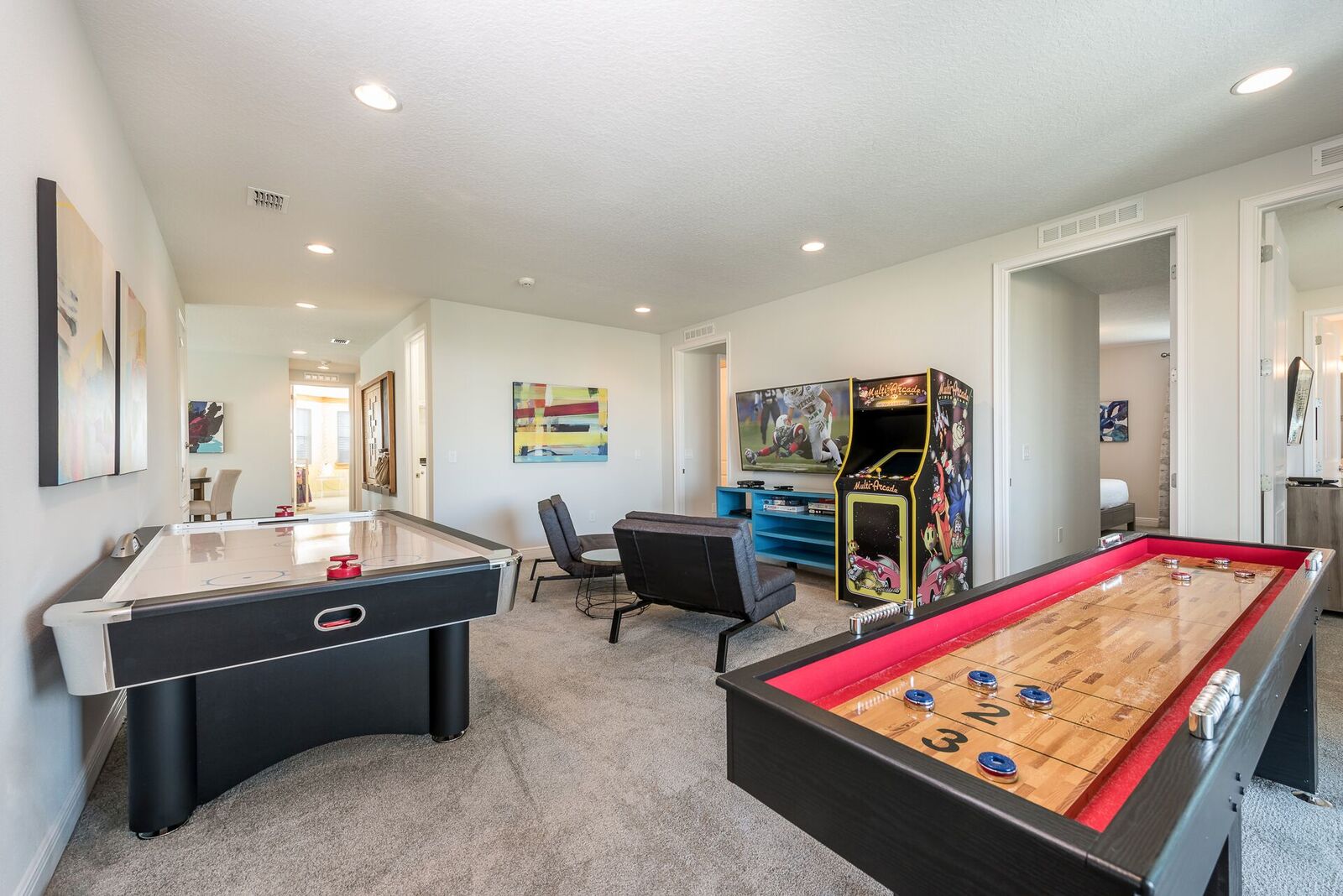 Upper floor entertainment loft area has a wet bar, 4 seat high top table, 2x accent chairs, large flat screen TV with a PS4 video game console, video games and board games, multi-arcade video game, shuffleboard and air hockey table, large wall scrabble game