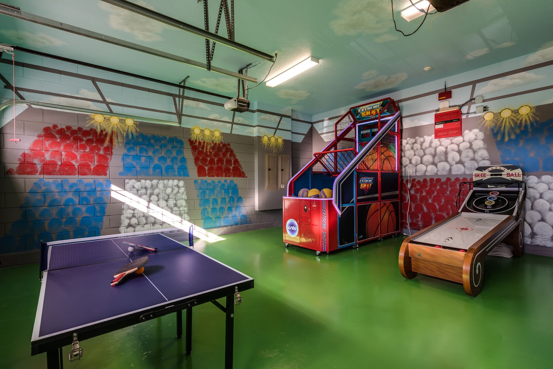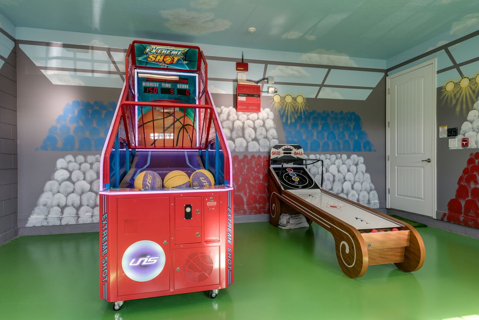 Games room has a ping pong table, basketball shooting game, and skeeball