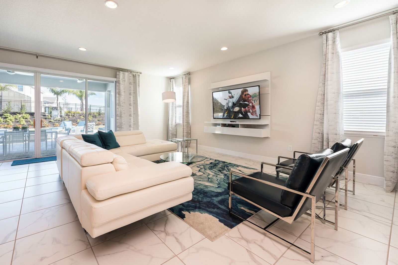 Spacious comfortable seating area with a leather sectional and 2x accent chairs overlooking the private pool deck through sliding glass doors