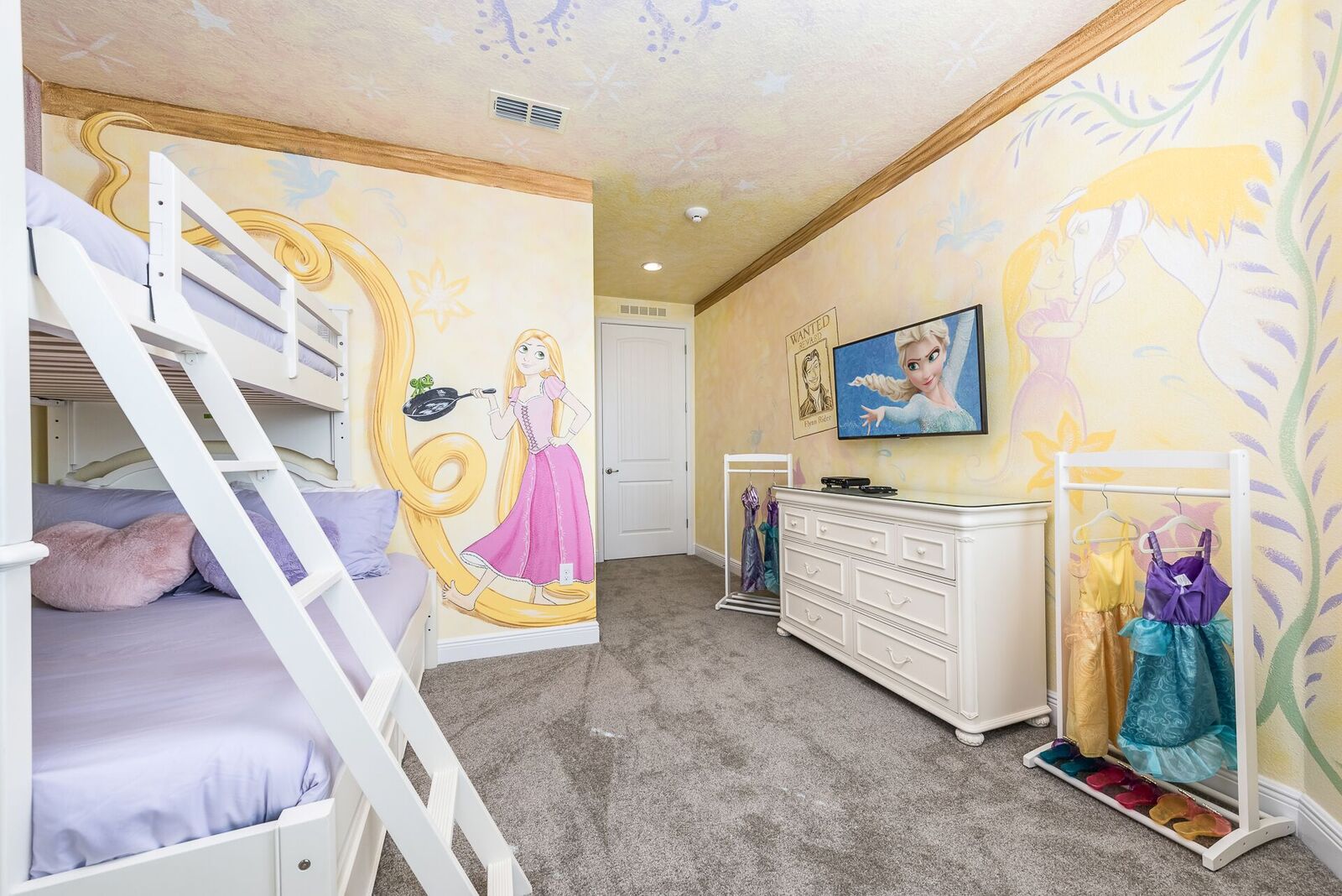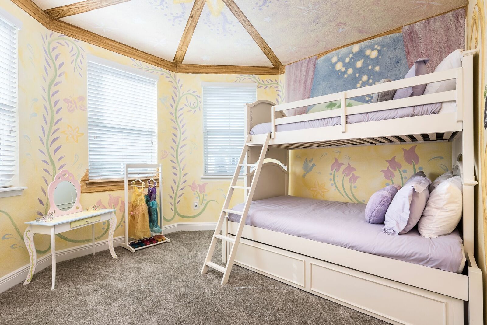 'Tangled' themed bedroom with bunk beds (Twin and Full sized bed), dress up station