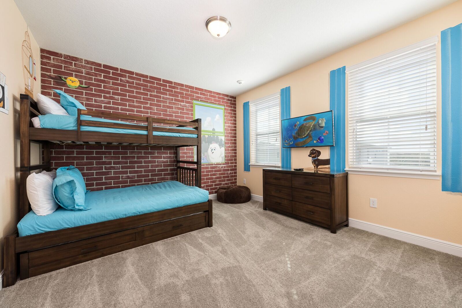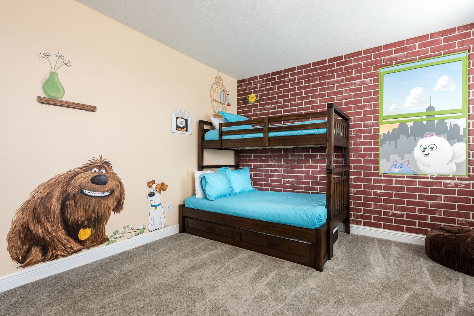 'Secret Life of Pets' themed bedroom with bunk beds (Twin and Full sized bed, extra Twin sized bed underneath), bean bag chair